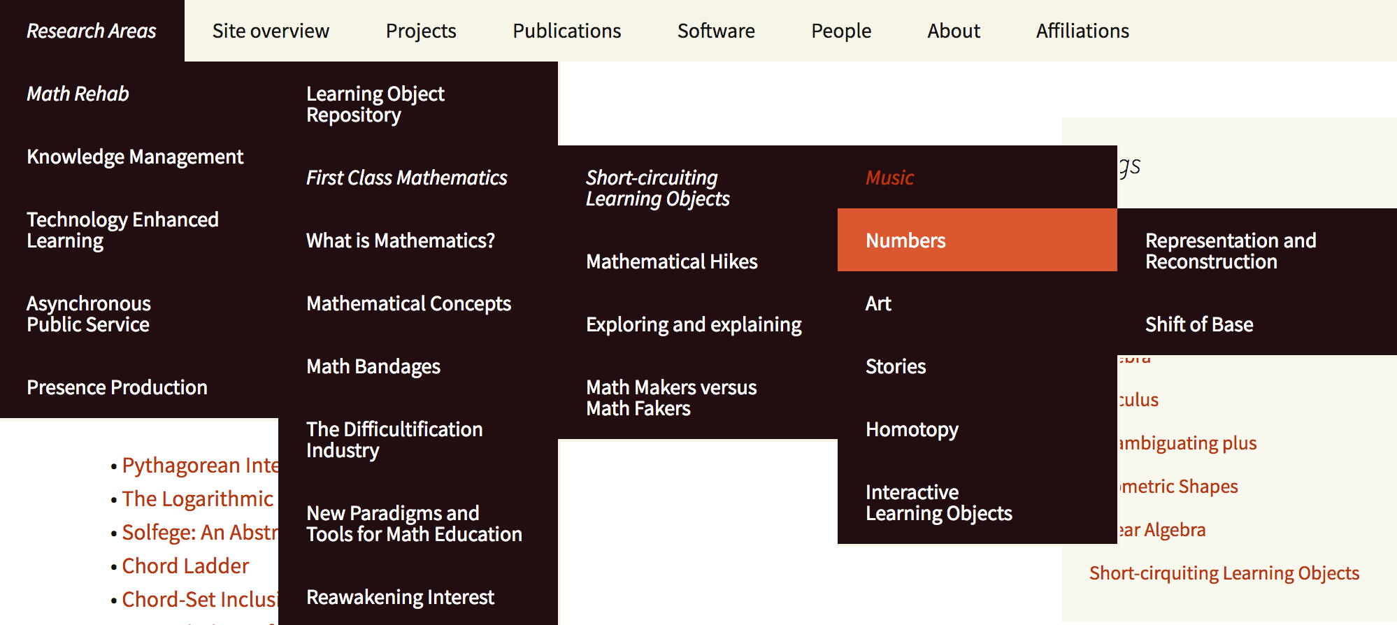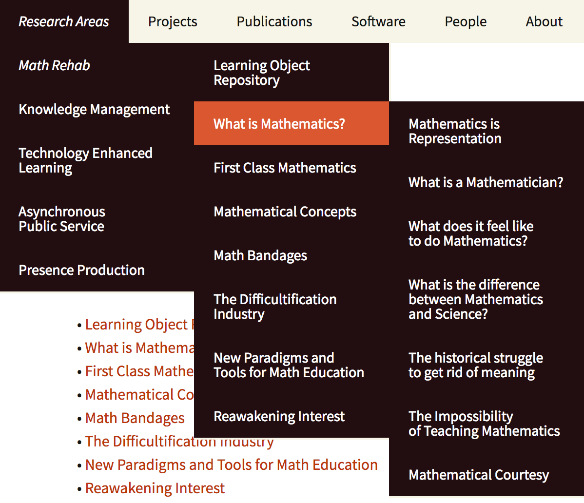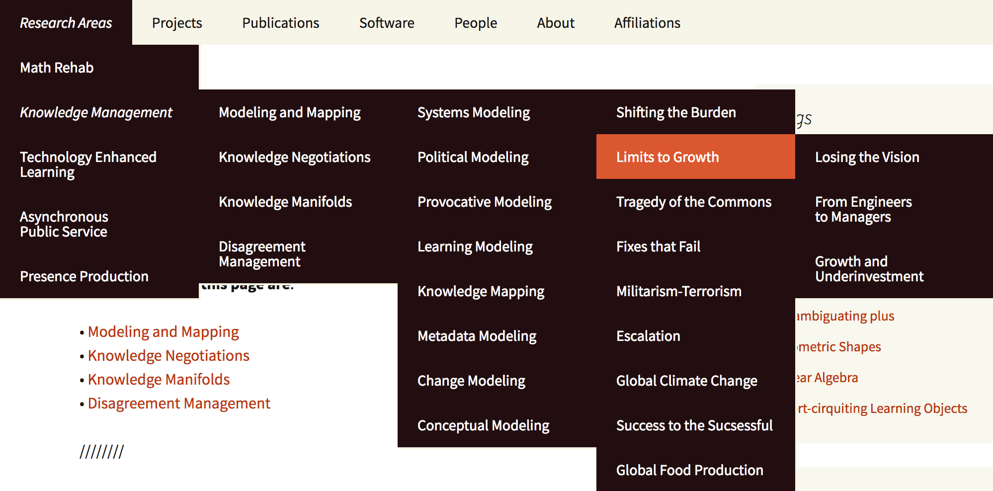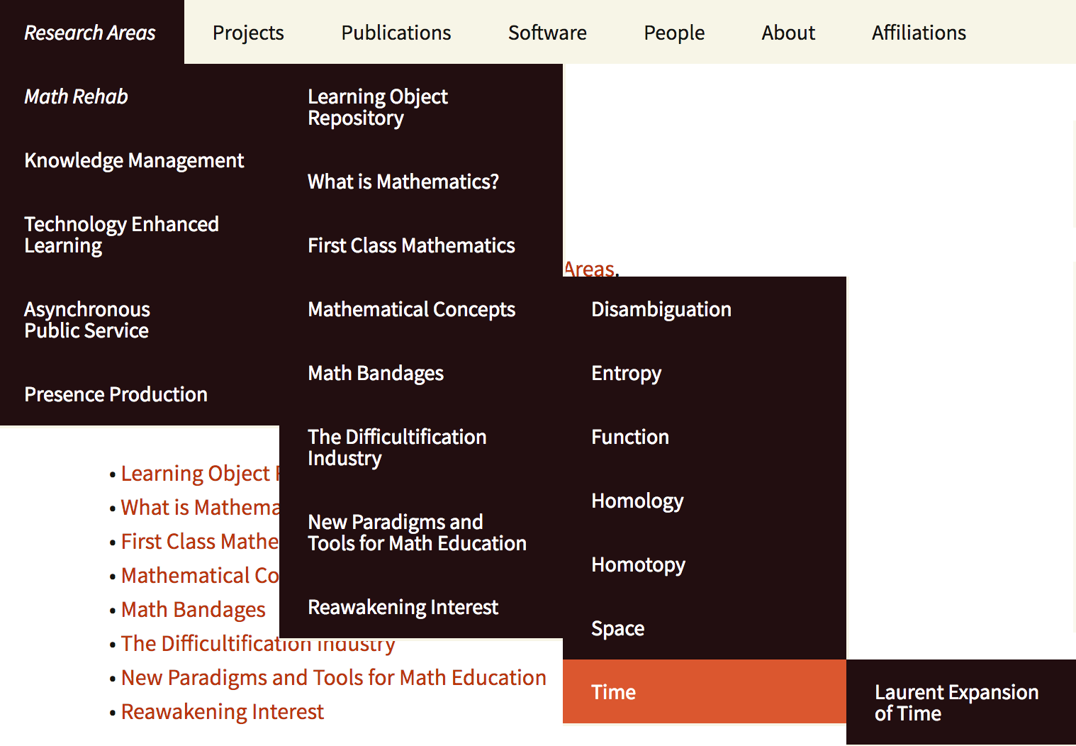 and navigating the drop-down menus “from left to right”. When the number of sub-sub-sub- … menus becomes too large to display simultaneously, you can continue down the sub-menus by navigating horizontally across to the next sub-level to the right and then navigating vertically within that sub-level. This can sometimes be a bit tricky since there is a tendency to “lose the horizontality” of the cursor movement. If the horizontal cursor motion is violated, the entire tree of open sub-menus disappears.