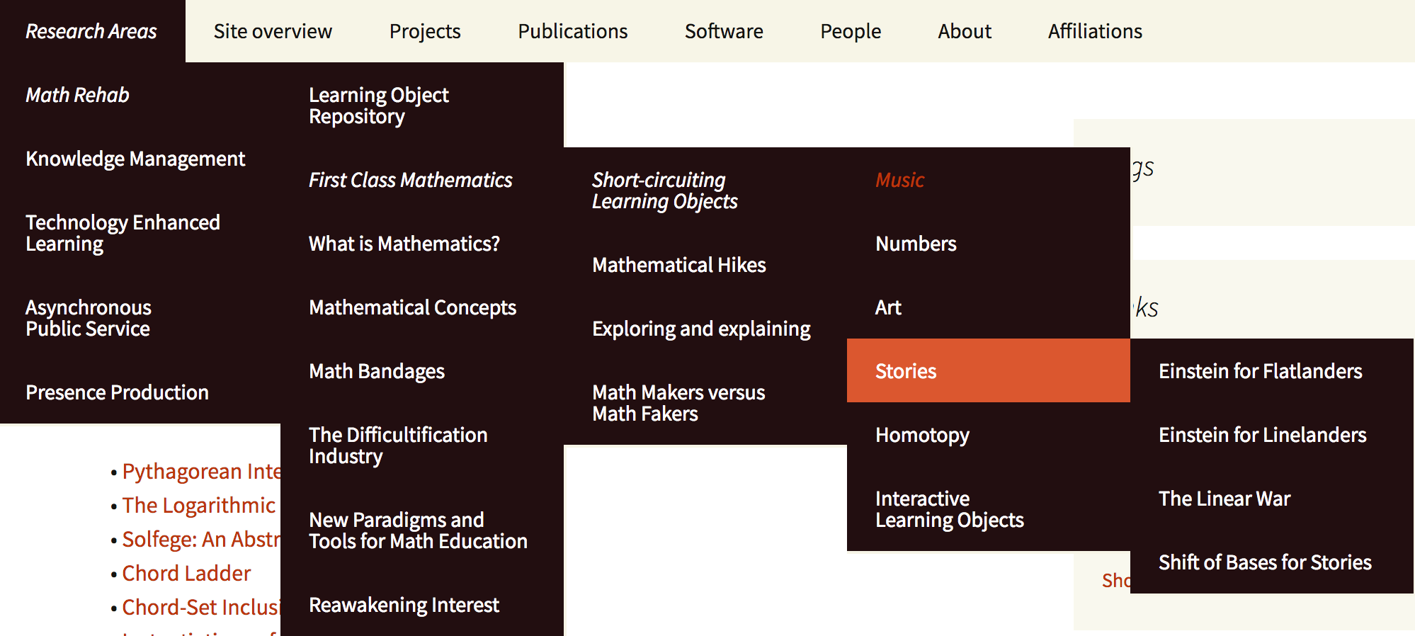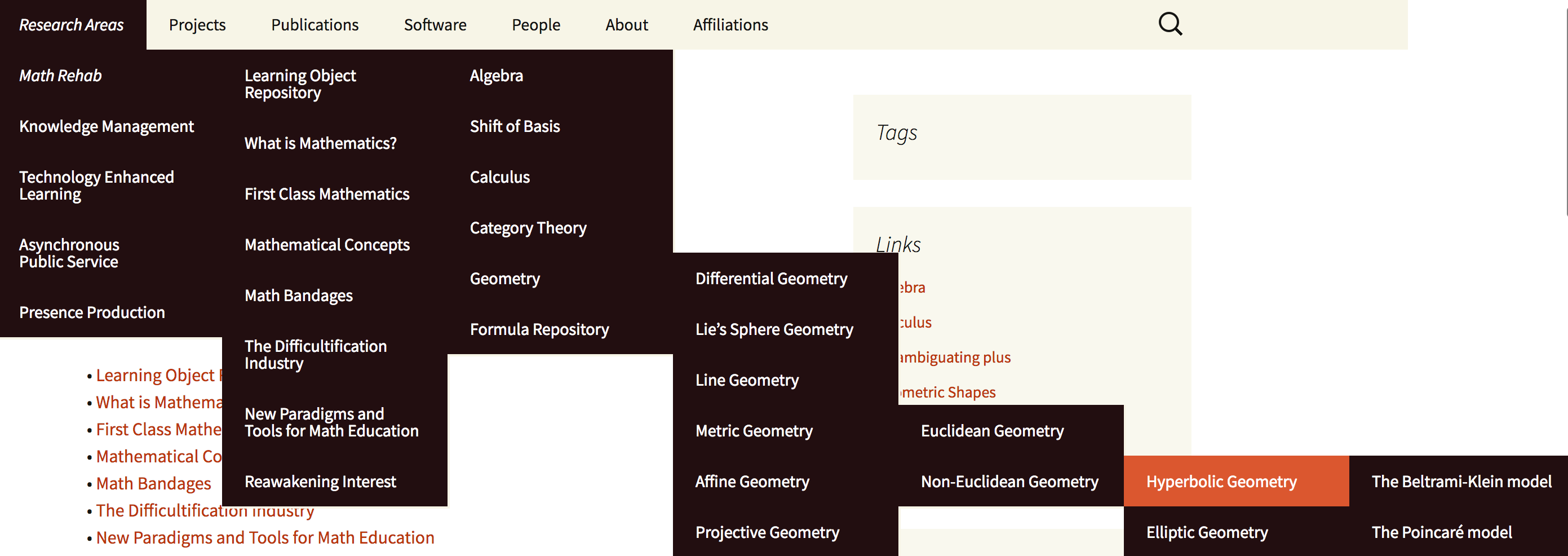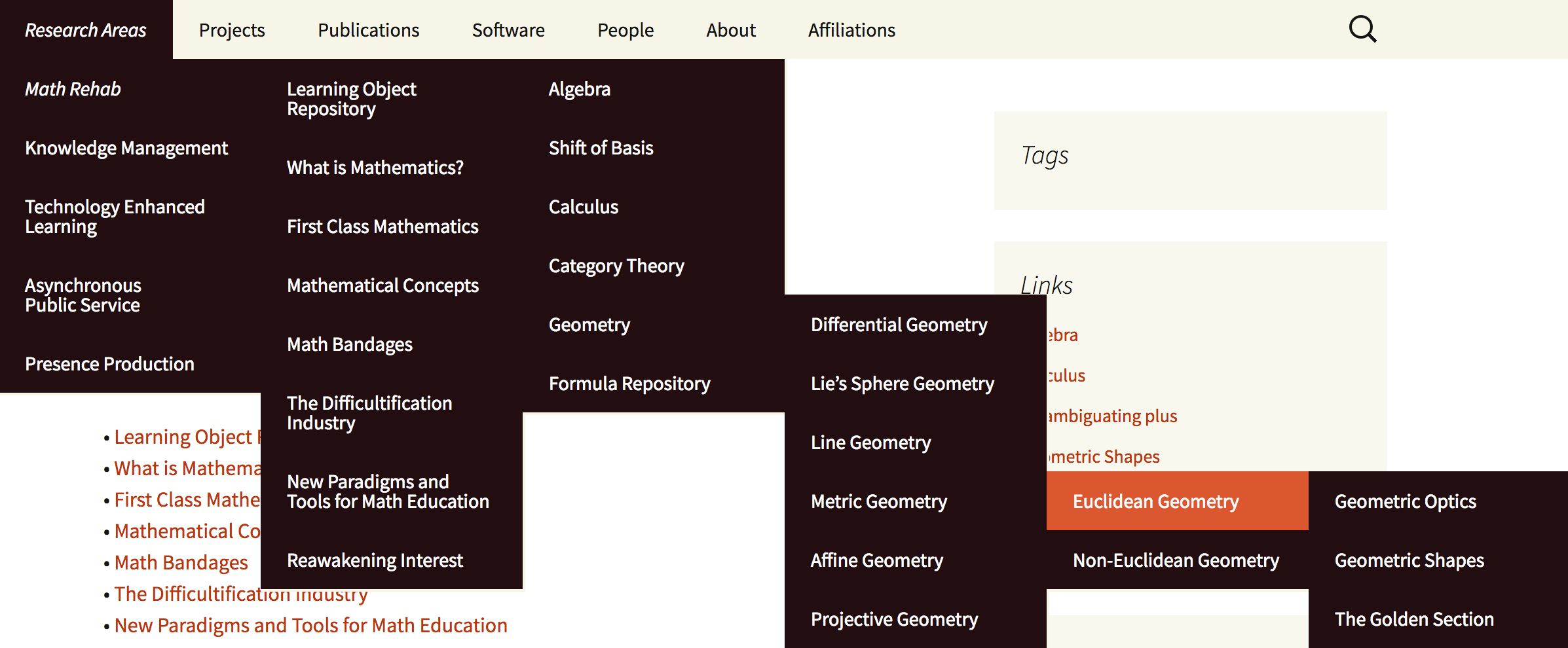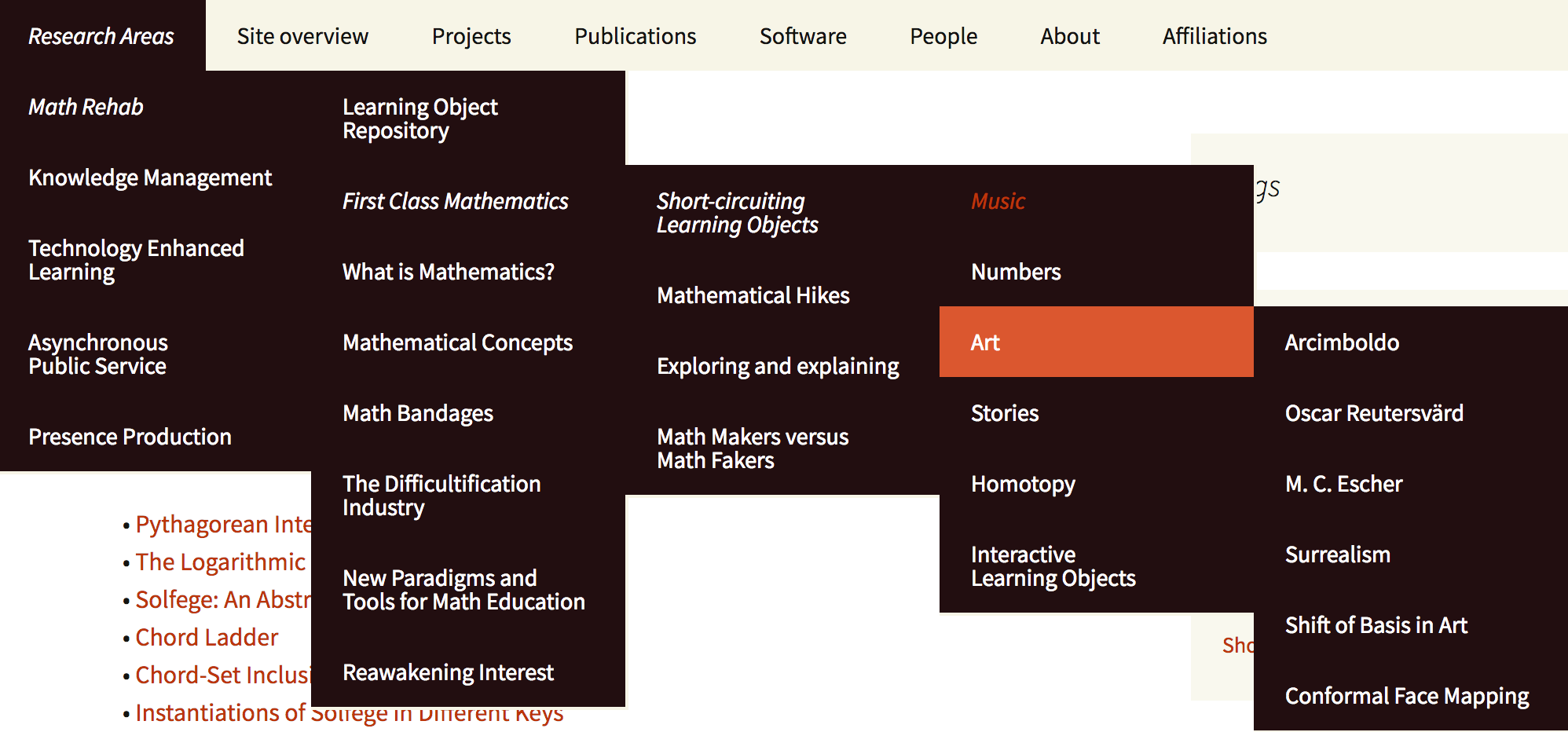and navigating the drop-down menus “from left to right”. When the number of sub-sub-sub- … menus becomes too large to display simultaneously, you can continue down the sub-menus by navigating horizontally across to the next sub-level to the right and then navigating vertically within that sub-level. This can sometimes be a bit tricky since there is a tendency to “lose the horizontality” of the cursor movement. If the horizontal cursor motion is violated, the entire tree of open sub-menus disappears.