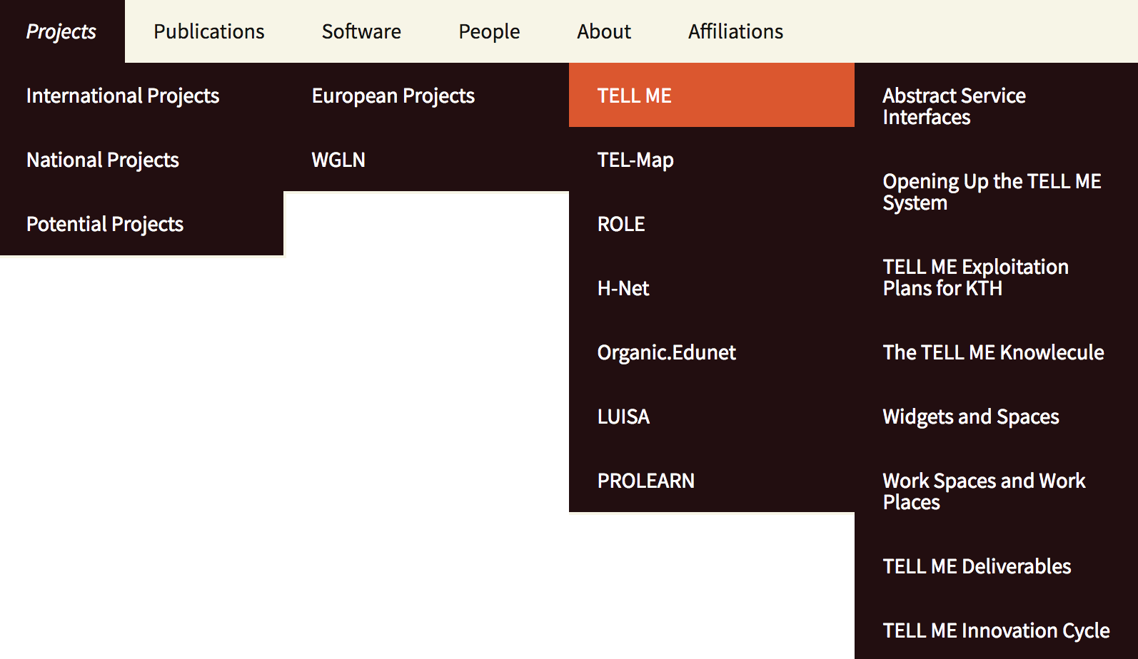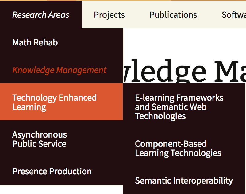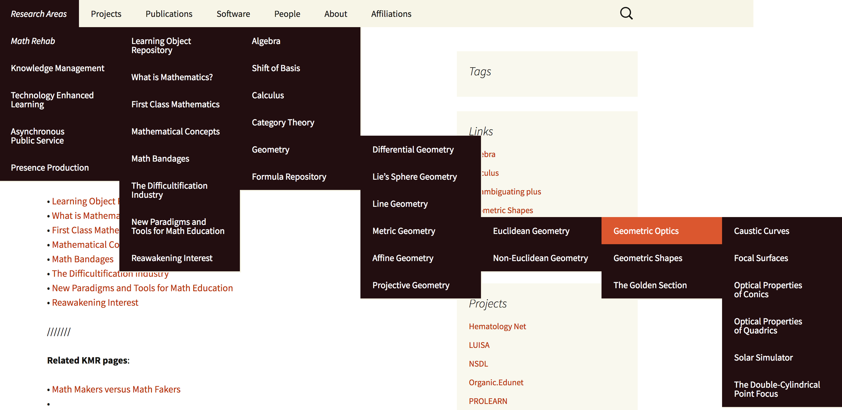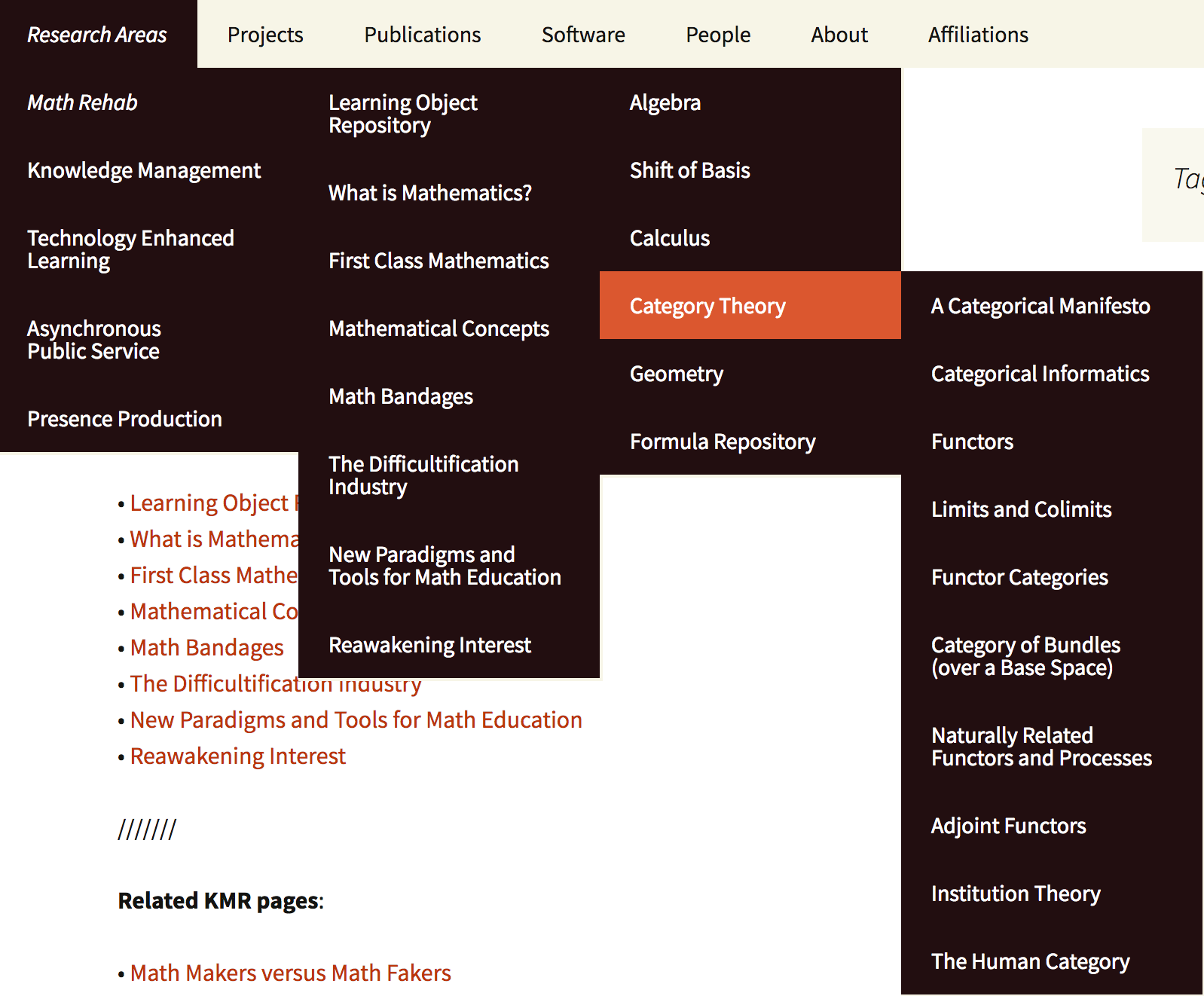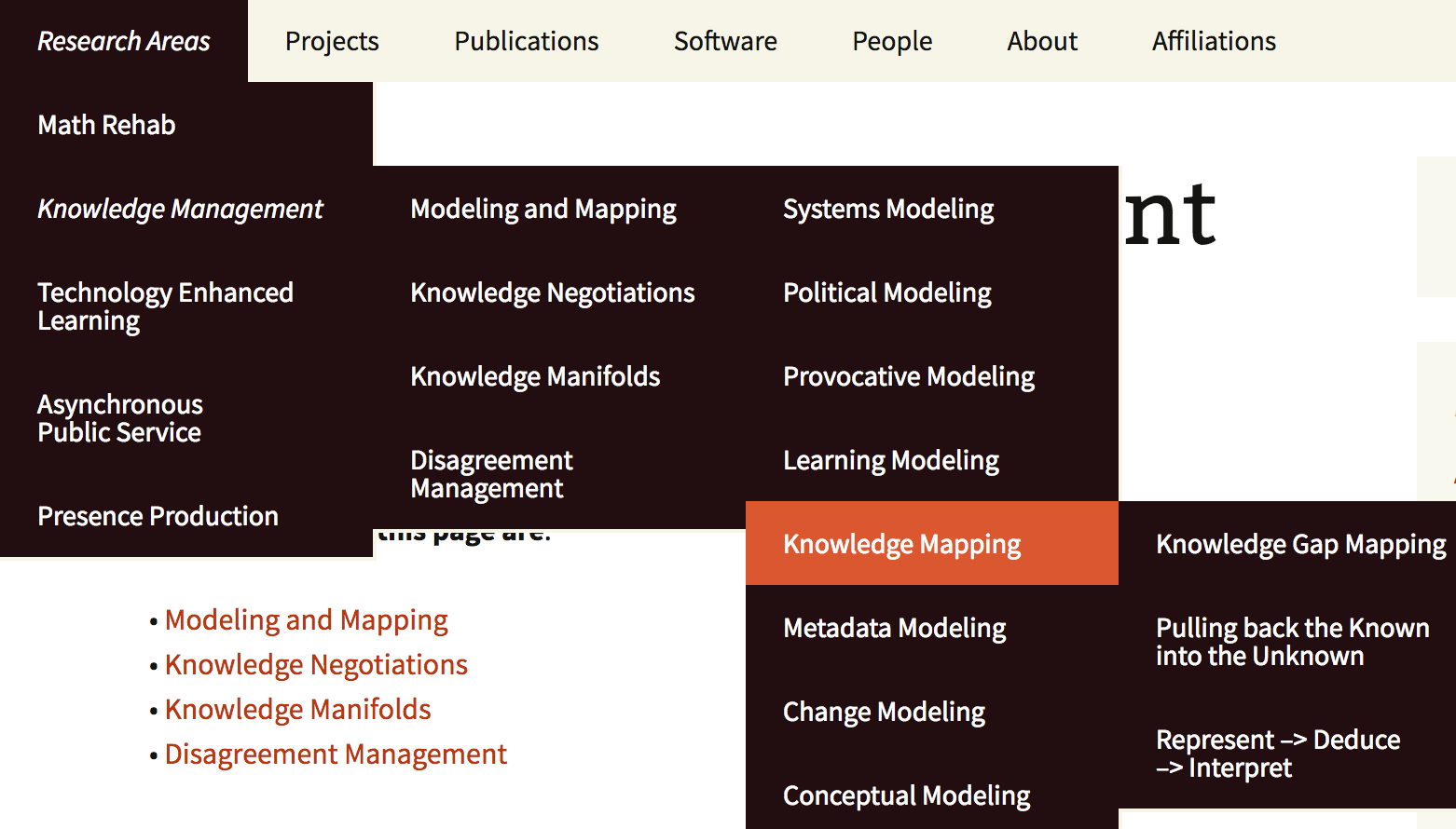 This page provides a set of screenshots of some of the drop-down menus of the KMR web site. The purpose is to provide a visual overview of its thematic structure and to show the semantic proximity of some of the appearing concepts and constructions. The corresponding pages can be accessed by clicking their respective super-pages at the top: