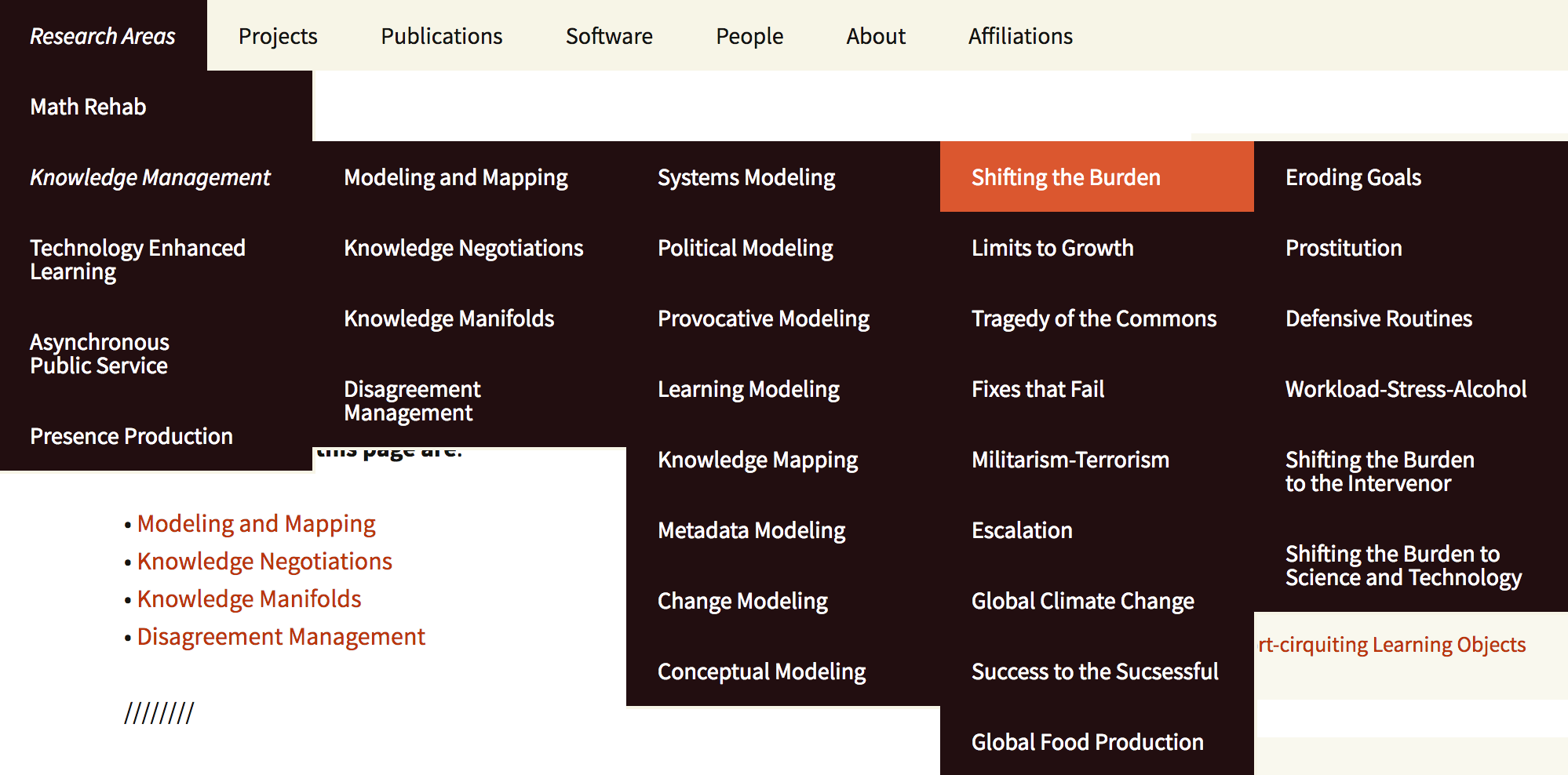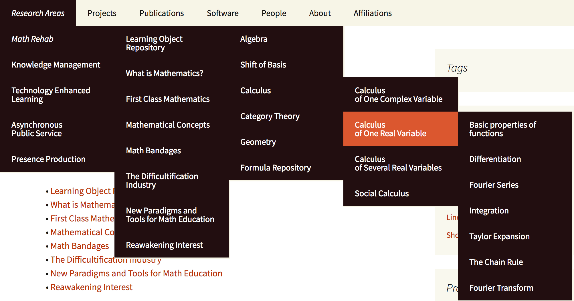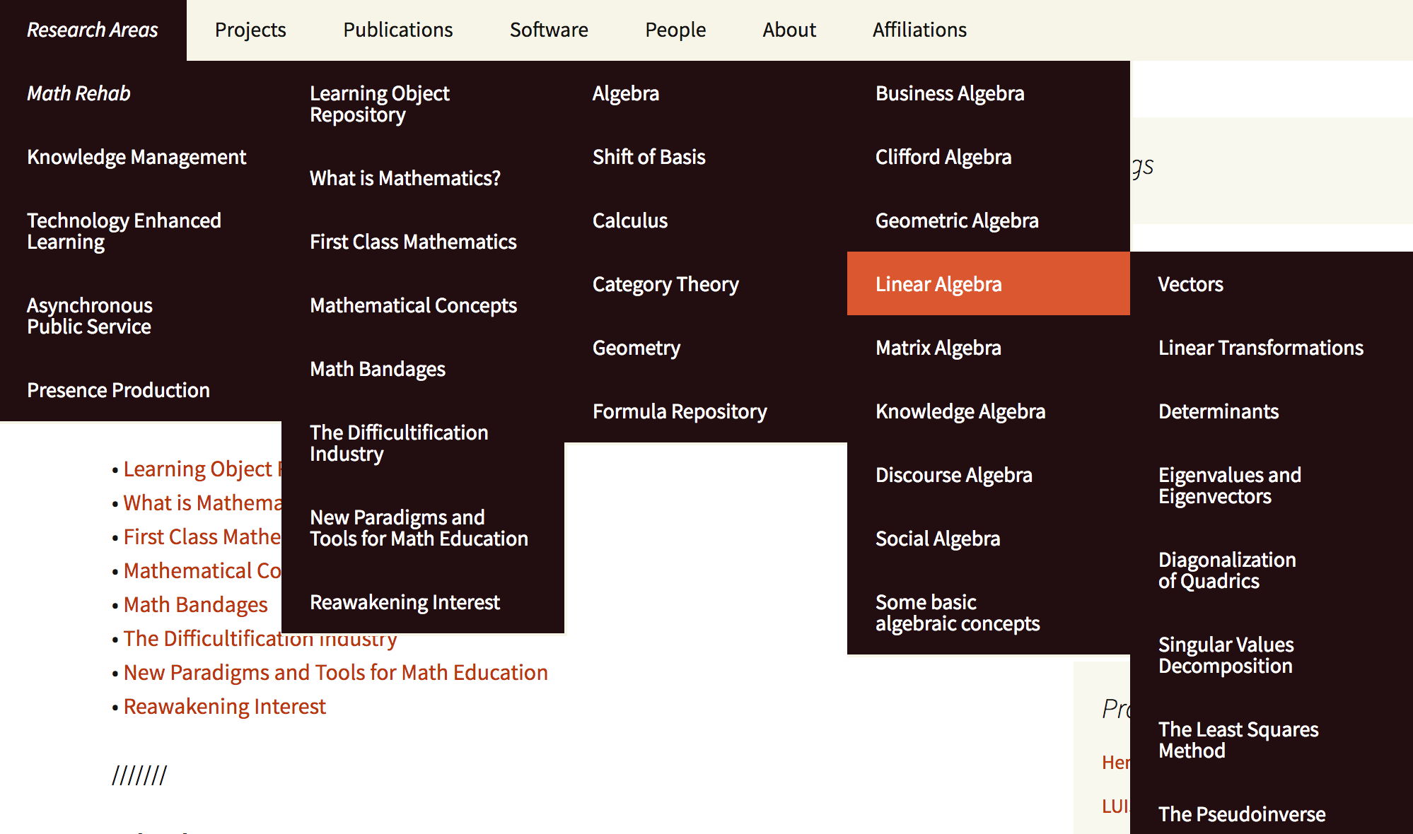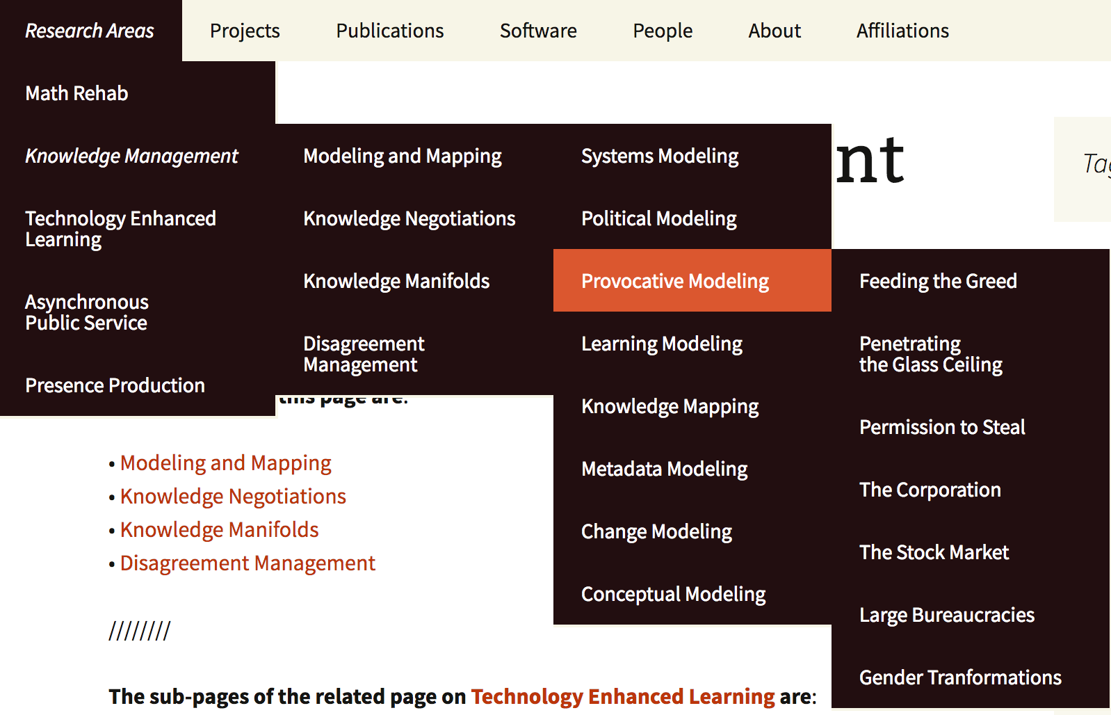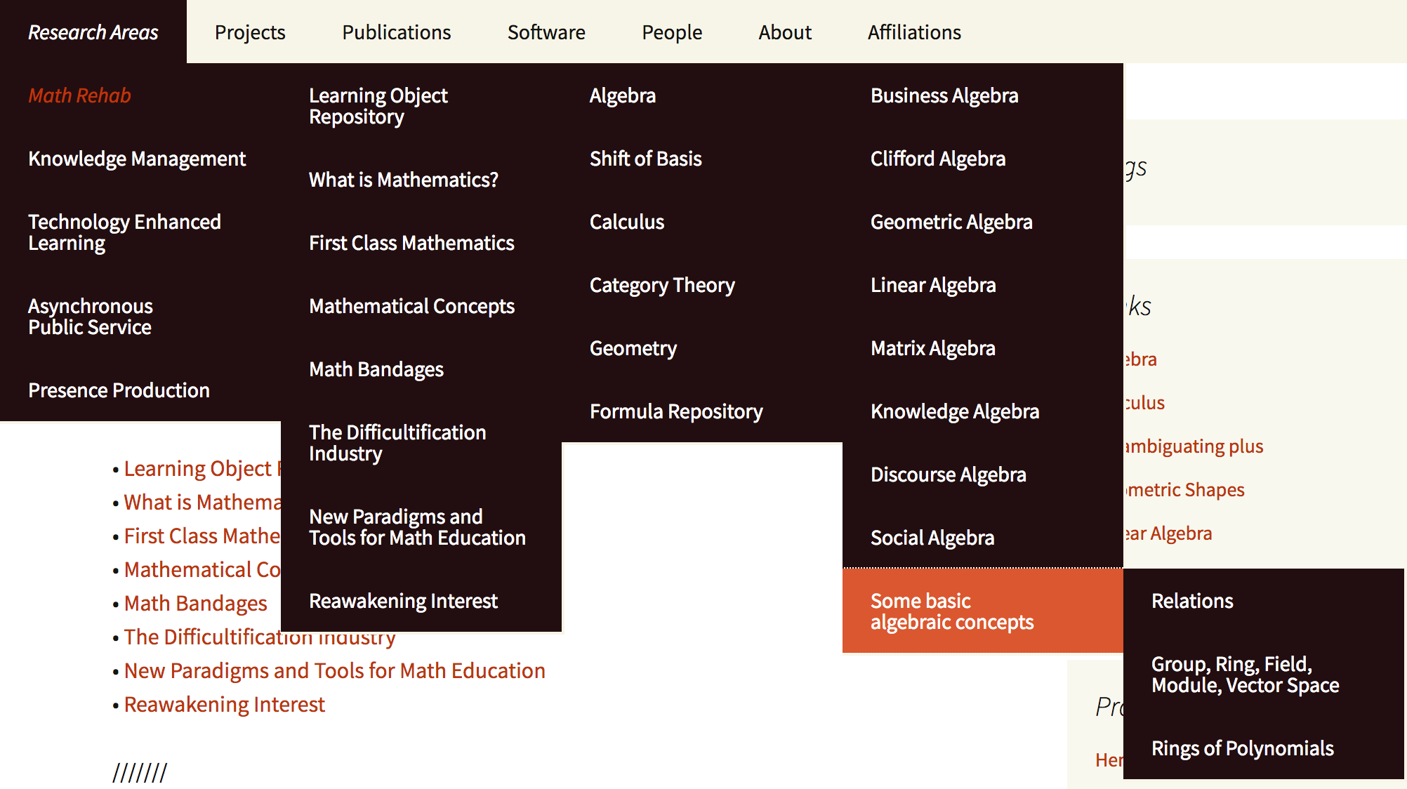 This page provides a set of screenshots of some of the drop-down menus of the KMR web site. The purpose is to provide a visual overview of its thematic structure and to show the semantic proximity of some of the appearing concepts and constructions. The corresponding pages can be accessed by clicking their respective super-pages at the top: