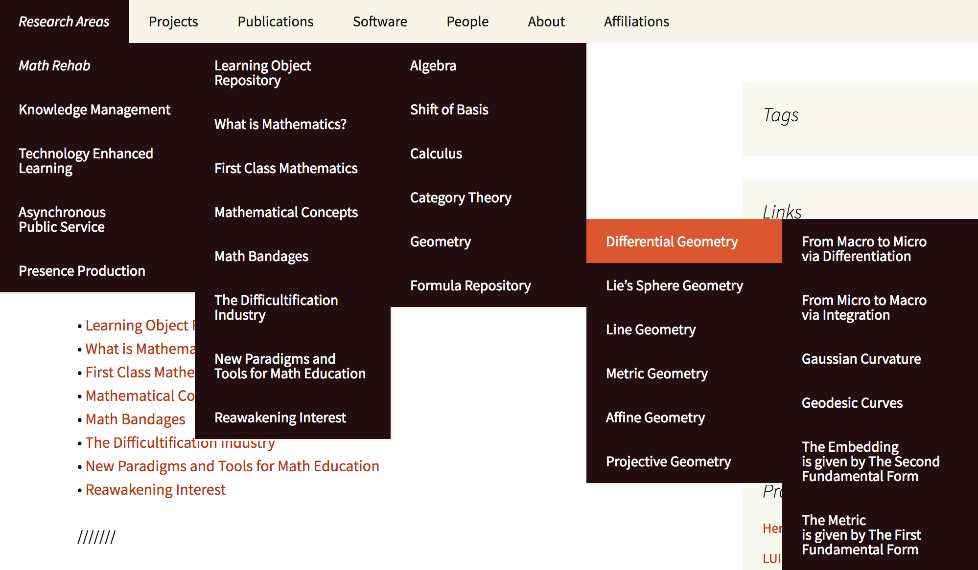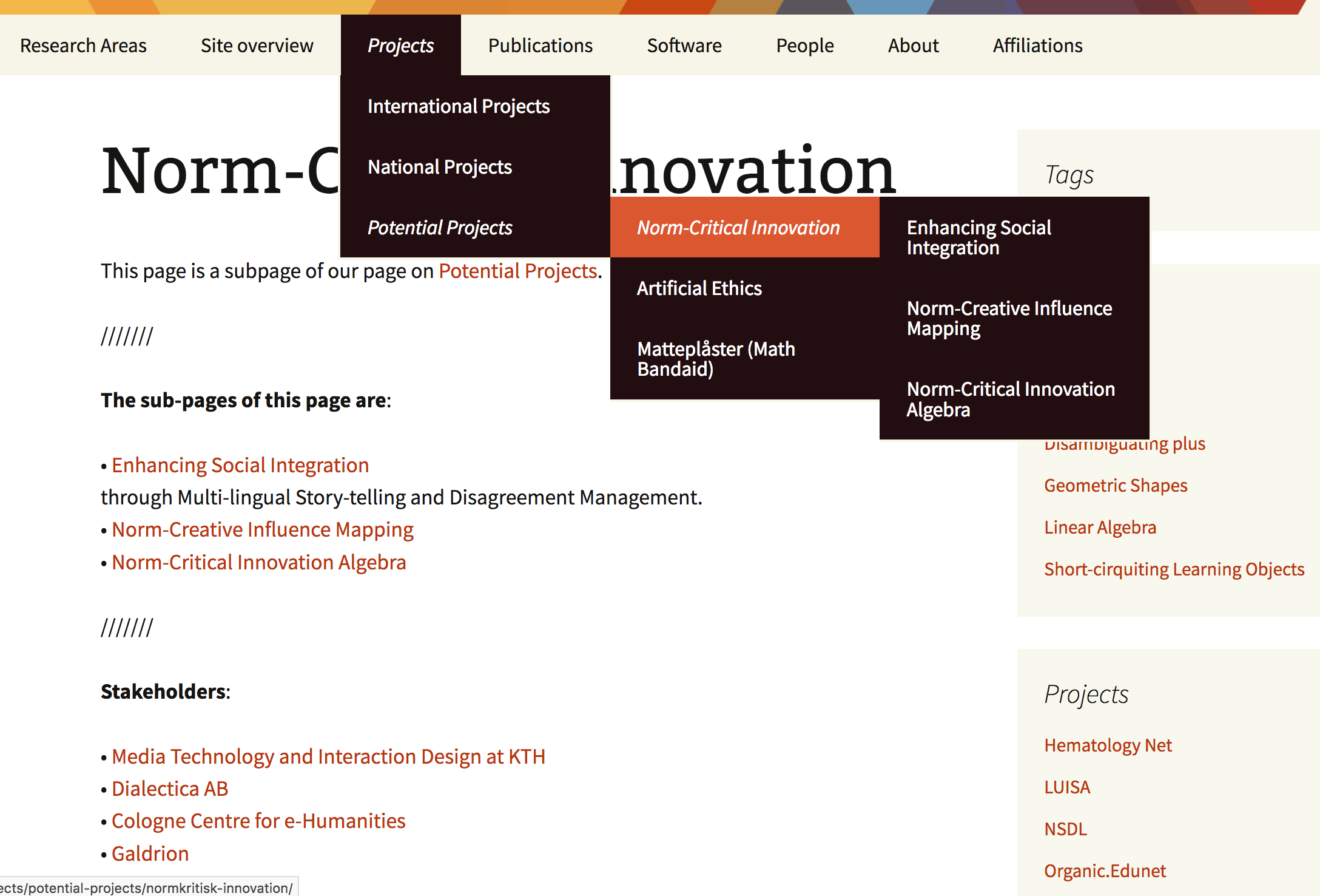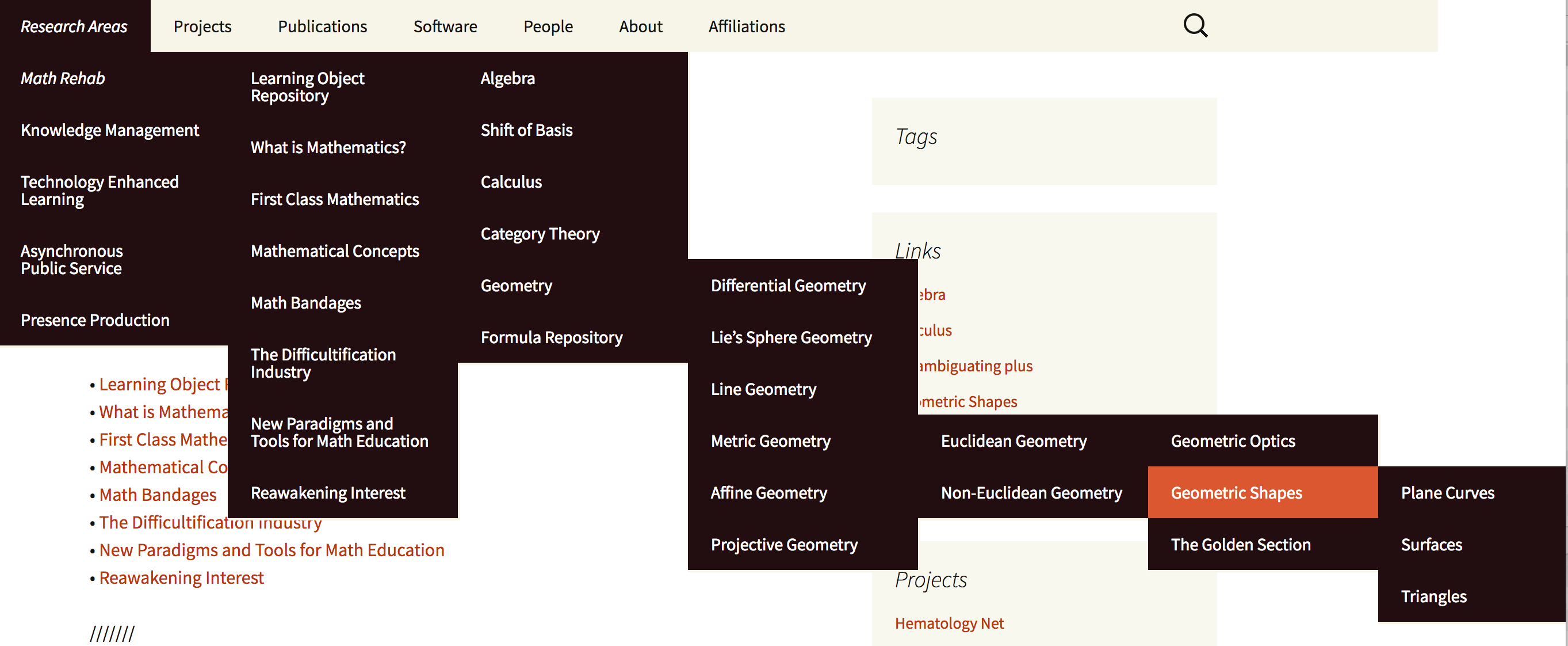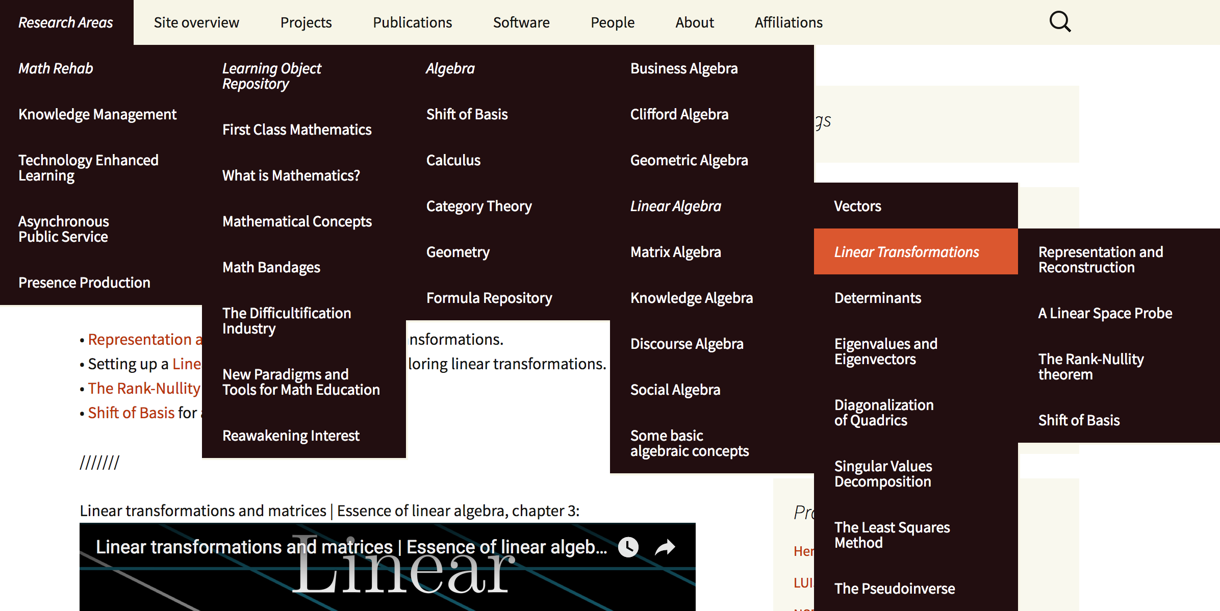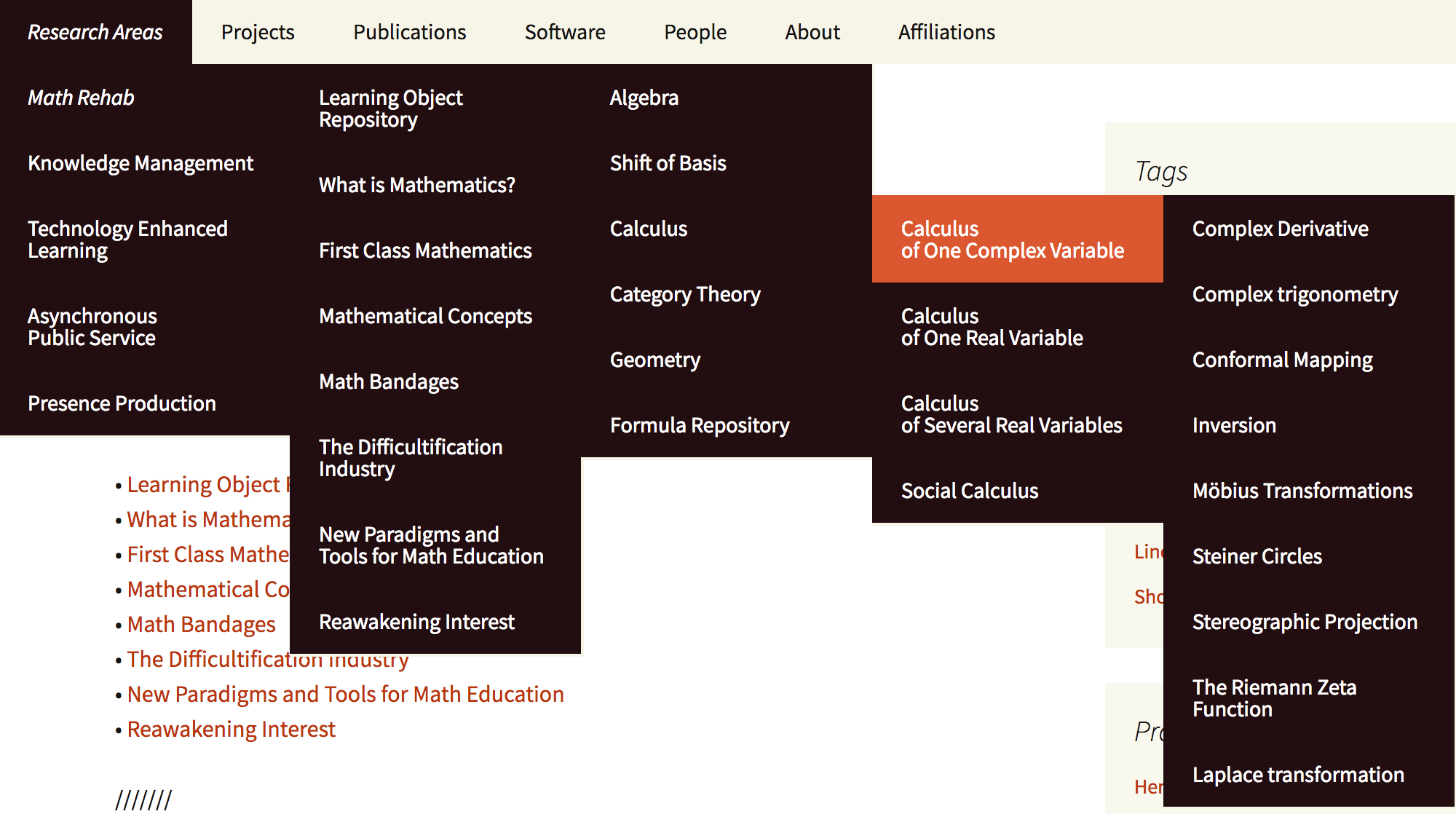 This page provides a set of screenshots of some of the drop-down menus of the KMR web site. The purpose is to provide a visual overview of its thematic structure and to show the semantic proximity of some of the appearing concepts and constructions. The corresponding pages can be accessed by clicking their respective super-pages at the top: