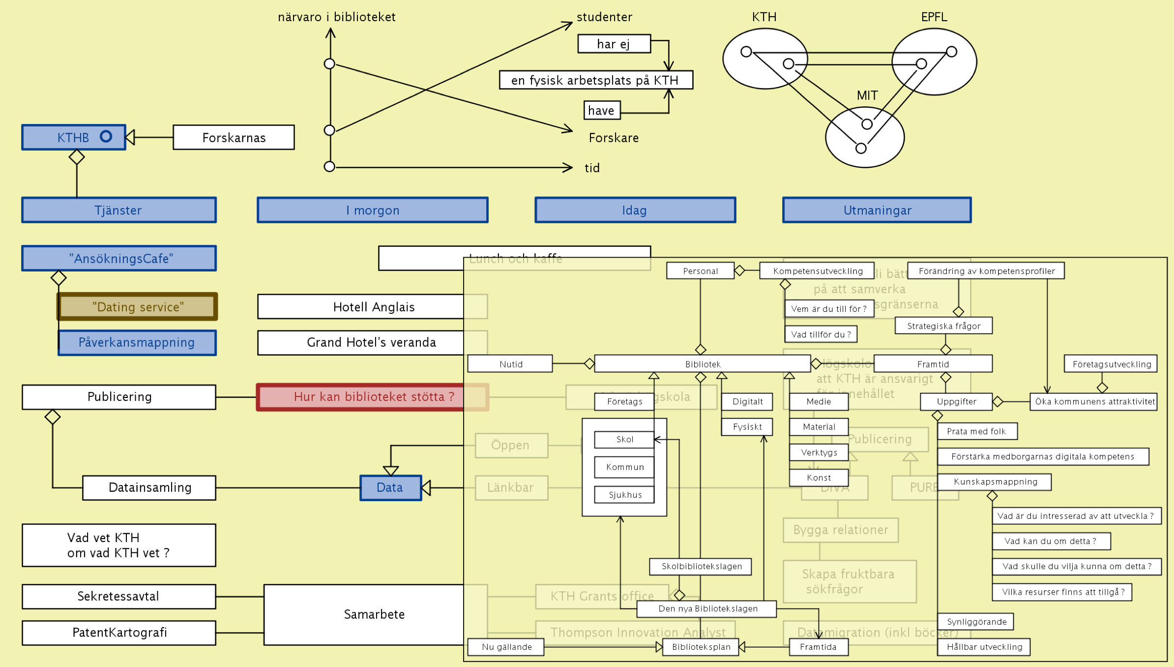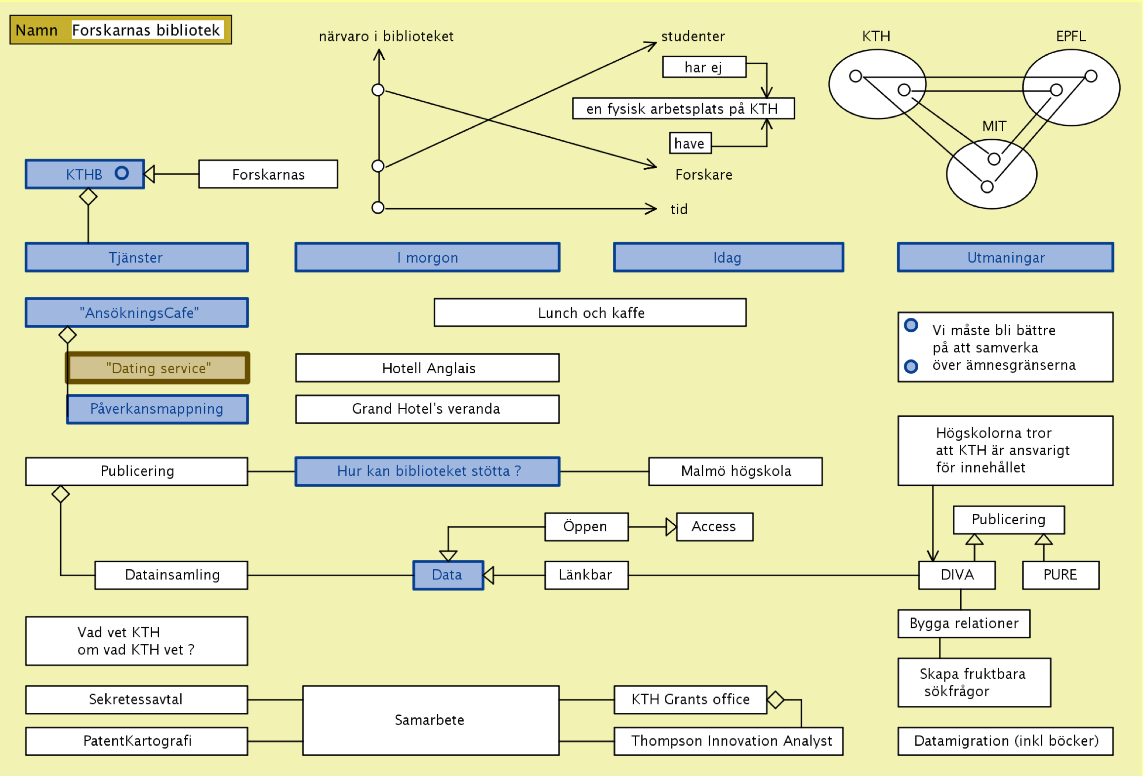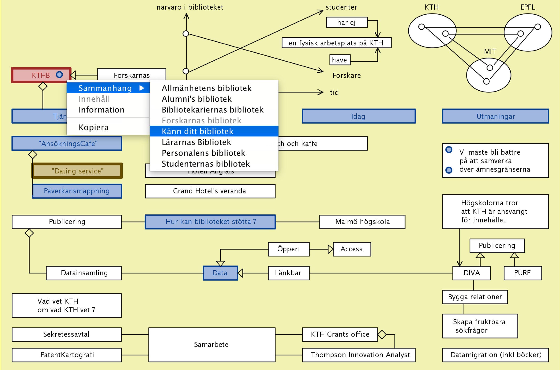 Biblioteket som värd för ”Proposal modeling for Horizon 2020” – en ny social umgängesform på KTH där bibliotekets modelleringsstationer kan användas – såväl synkront som asynkront – för att gemensamt modellera fram olika ansökningsförslag. En ”metavariant” av detta är utlysningspåverkansmodellering, (CfP influence mapping) som syftar till att ”påverka fram” utlysningar inom områden där svenska forsknings- och utvecklingskonstellationer är starka. Bibliotekets digitalt förstärkta modelleringsstationer kan här erbjuda en gemensam strategisk modelleringsmiljö för de nationella påverkansplattformar för utlysningar inom H2020 som finansieras av VINNOVA. En ansökan till VINNOVA om strategier för samverkan mellan specialistbibliotekarier och forskare för att få fram starkare ansökningar till H2020 är för närvarande under utarbetande i samverkan mellan ECE skolan på KTH och Bibliotekshögskolan.