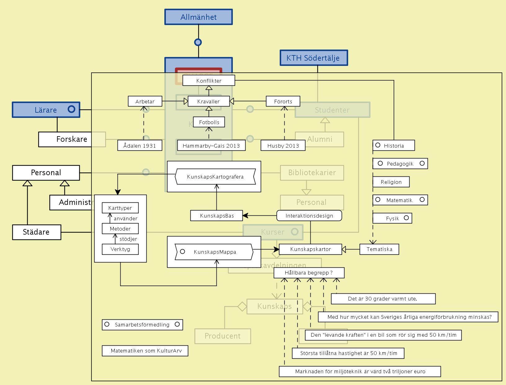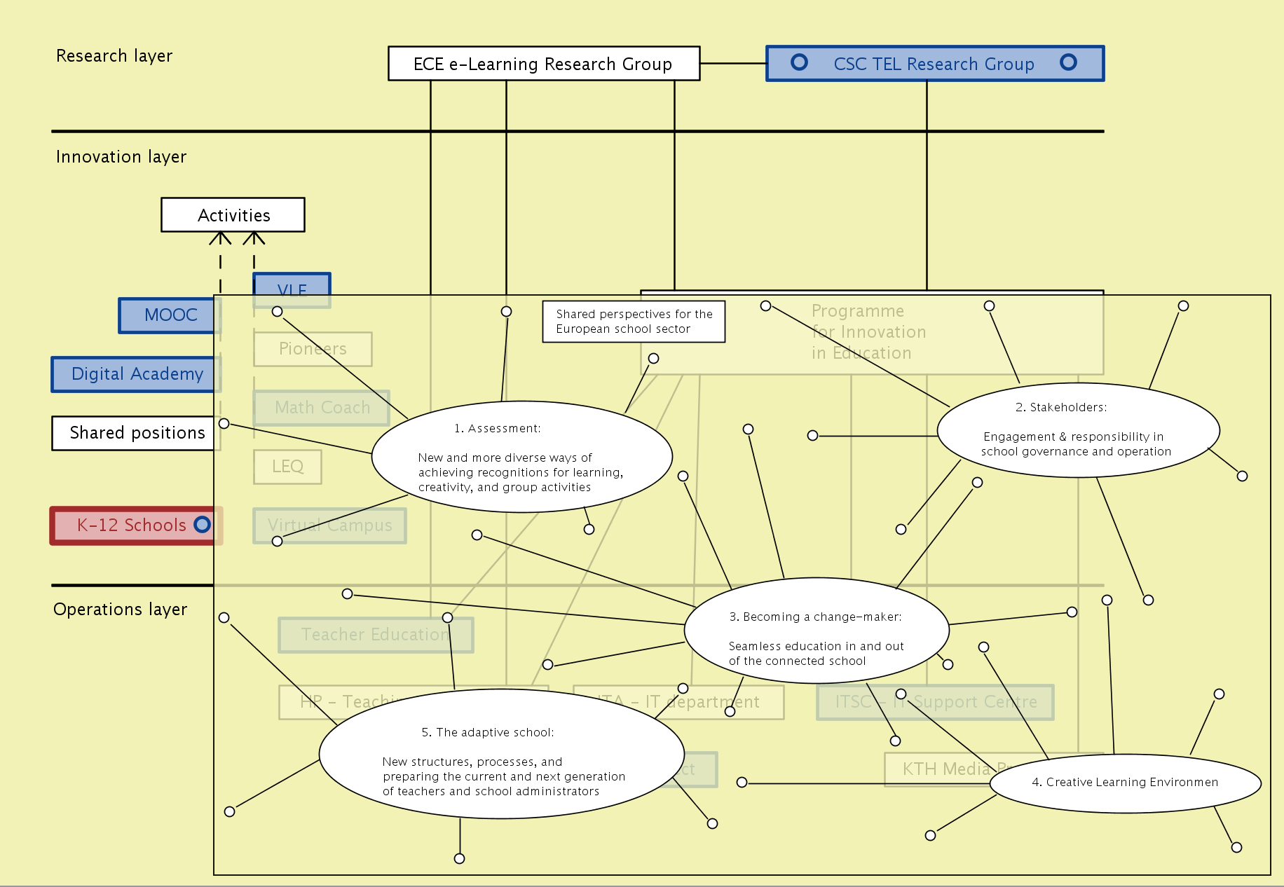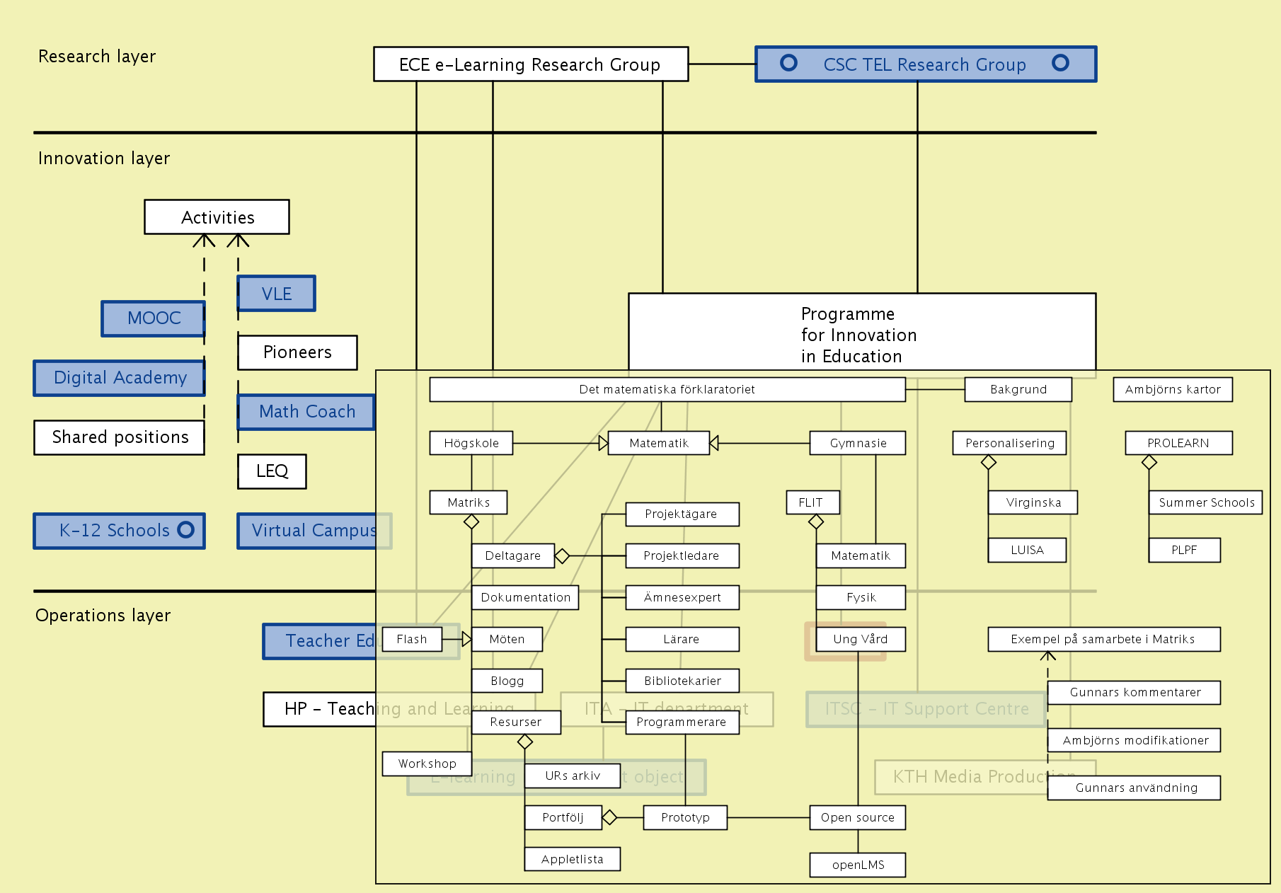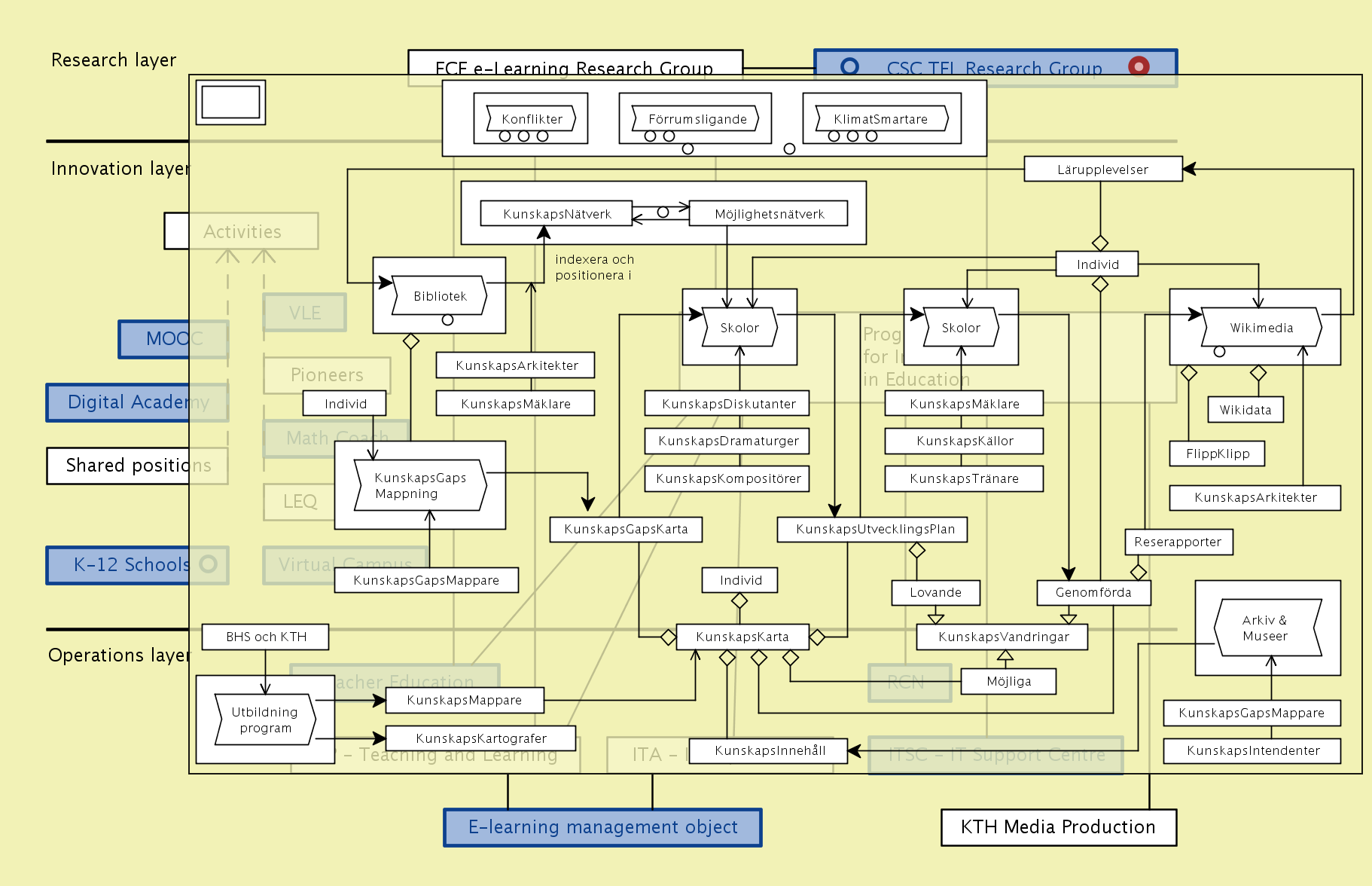 The overall concept of improvement-oriented knowledge modeling thus includes both the enhancement of the individual knowledge models / maps, and improvement of the various structures / methodologies that are used to describe / represent them. An important part of the knowledge modeling process is to learn from every experience and include this learning in the improvement process (so called double-loop learning). We call this improvement focus “better practice”. Here the ECE school collaborates with the MID (Media and Interaction Design) department at the CSC school whose members are experts in capturing and validating such an improvement-oriented feedback through various forms of participatory and user-centered design methodologies.