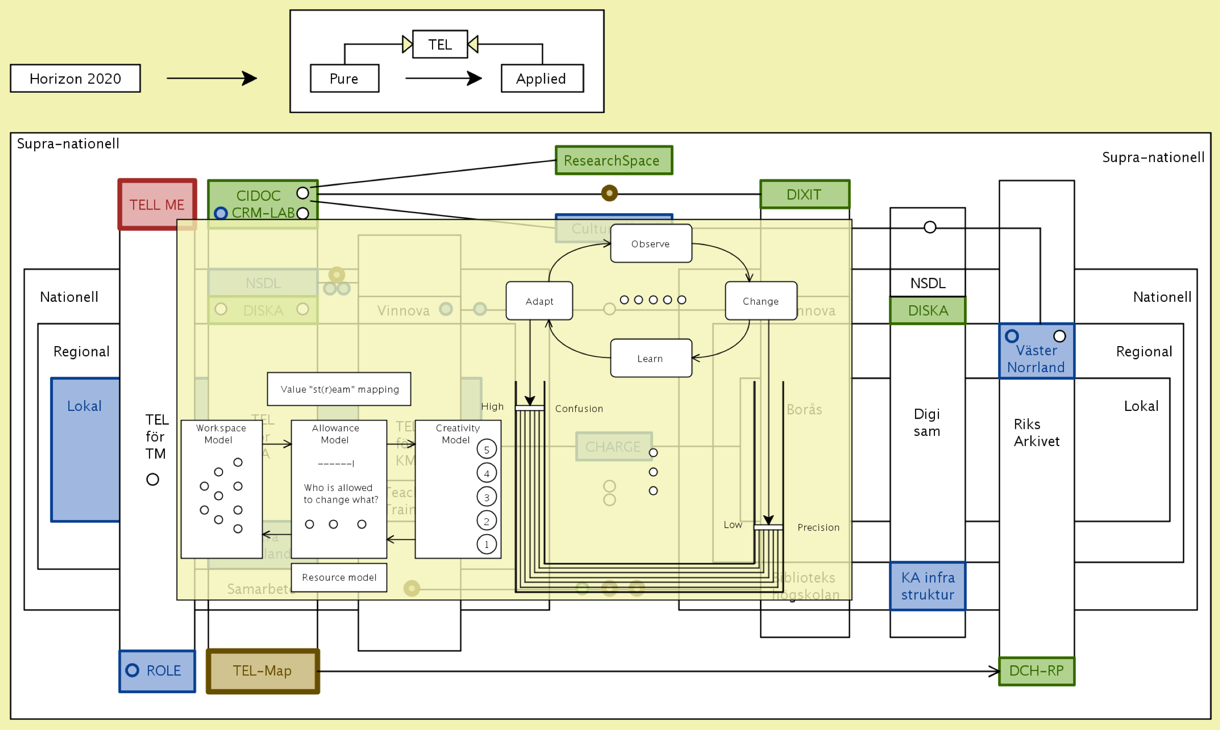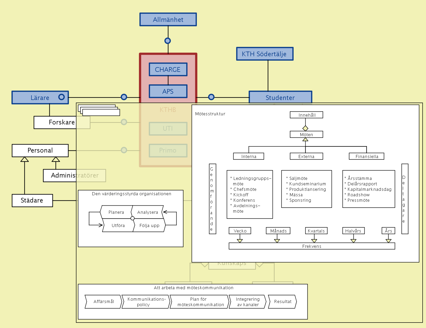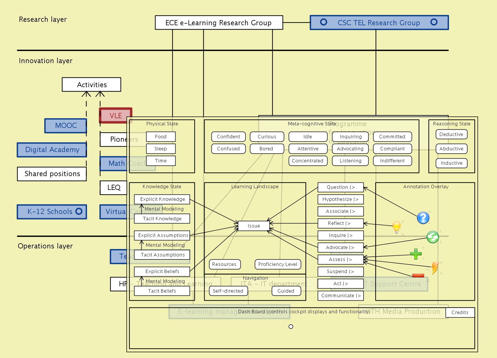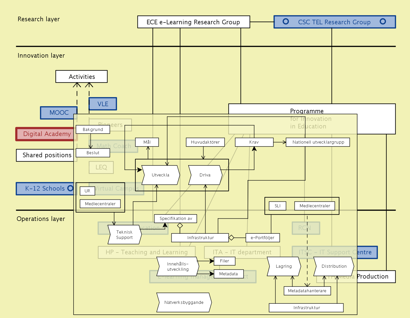 The overall concept of improvement-oriented knowledge modeling thus includes both the enhancement of the individual knowledge models / maps, and improvement of the various structures / methodologies that are used to describe / represent them. An important part of the knowledge modeling process is to learn from every experience and include this learning in the improvement process (so called double-loop learning). We call this improvement focus “better practice”. Here the ECE school collaborates with the MID (Media and Interaction Design) department at the CSC school whose members are experts in capturing and validating such an improvement-oriented feedback through various forms of participatory and user-centered design methodologies.