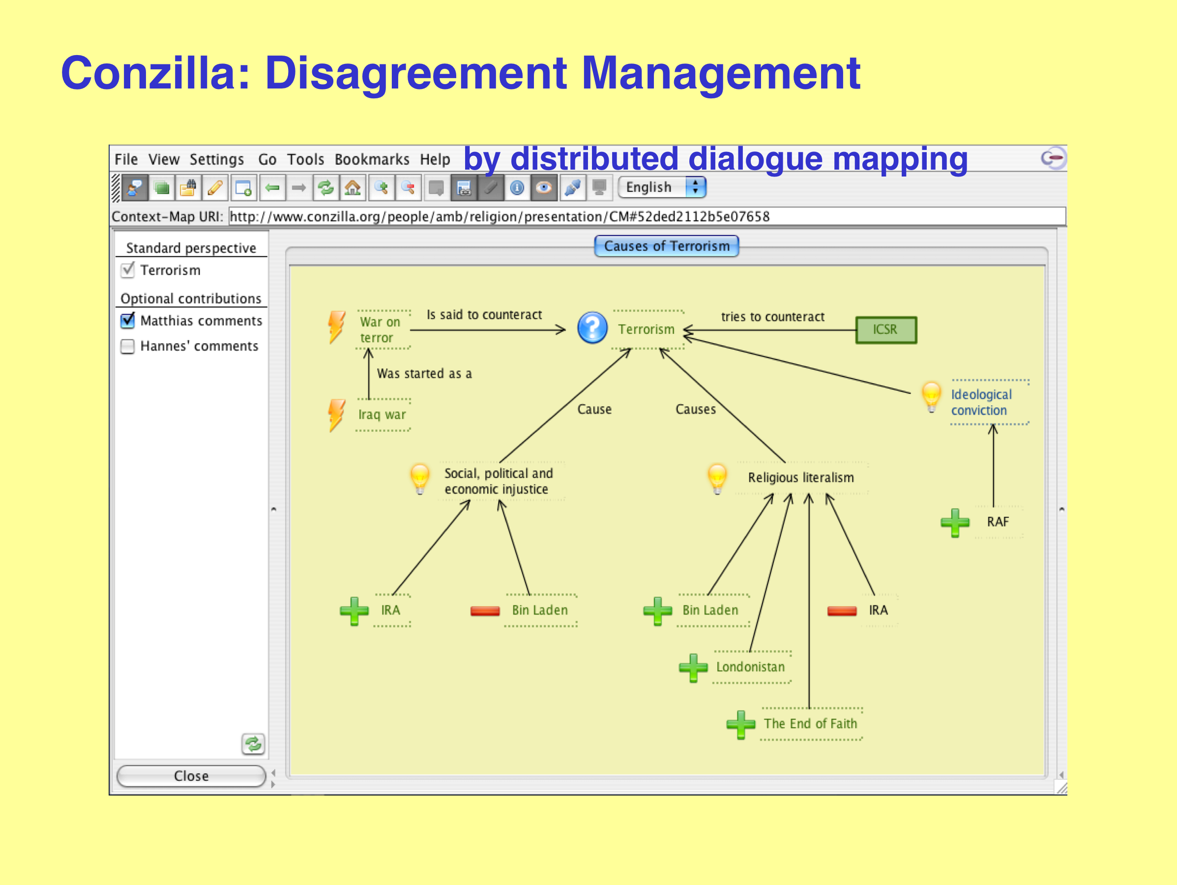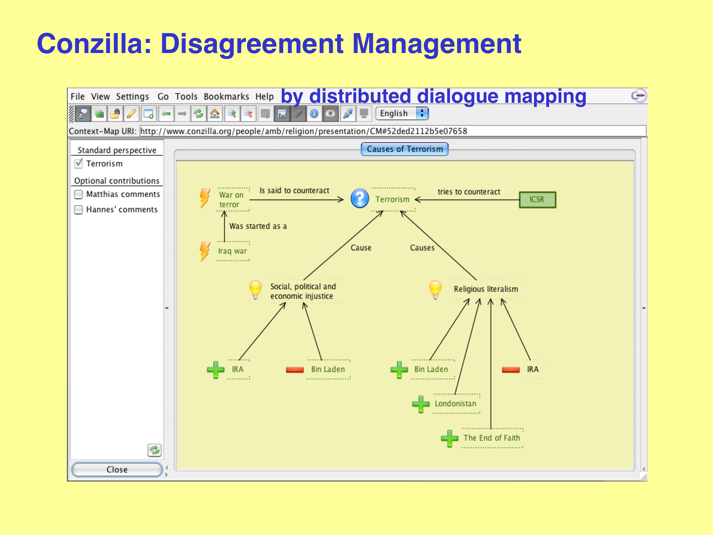 We will now present an example of Distributed Dialogue Mapping. The initial perspective (created by Ambjörn) is presented in Figure 73. The issue in question is Terrorism (the blue question mark) and there are two ideas (the yellow light-bulbs) on possible causes. The first idea, Social, political and economic injustice, is strengthened (the green plus-sign) by the IRA (Irish Republican Army) and weakened (the red minus-sign) by Bin Laden. The second idea, Religious literalism is strengthened by Bin Laden, Londonistan (a book by Melanie Phillips), and The End of Faith (a book by Sam Harris) and weakened by the IRA.