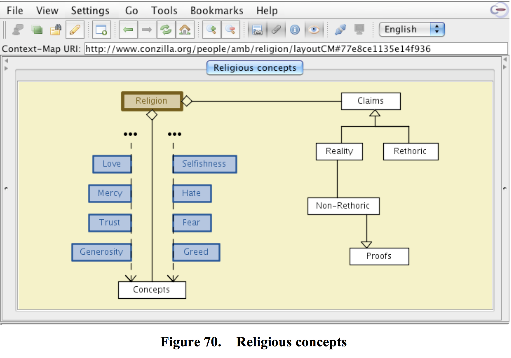Figure 70 shows a simple UML-based model of religion. It shows that Religion contains Concepts and Claims. Some examples of Concepts are also shown, with the dots indicating that there are many more religious concepts not shown here.