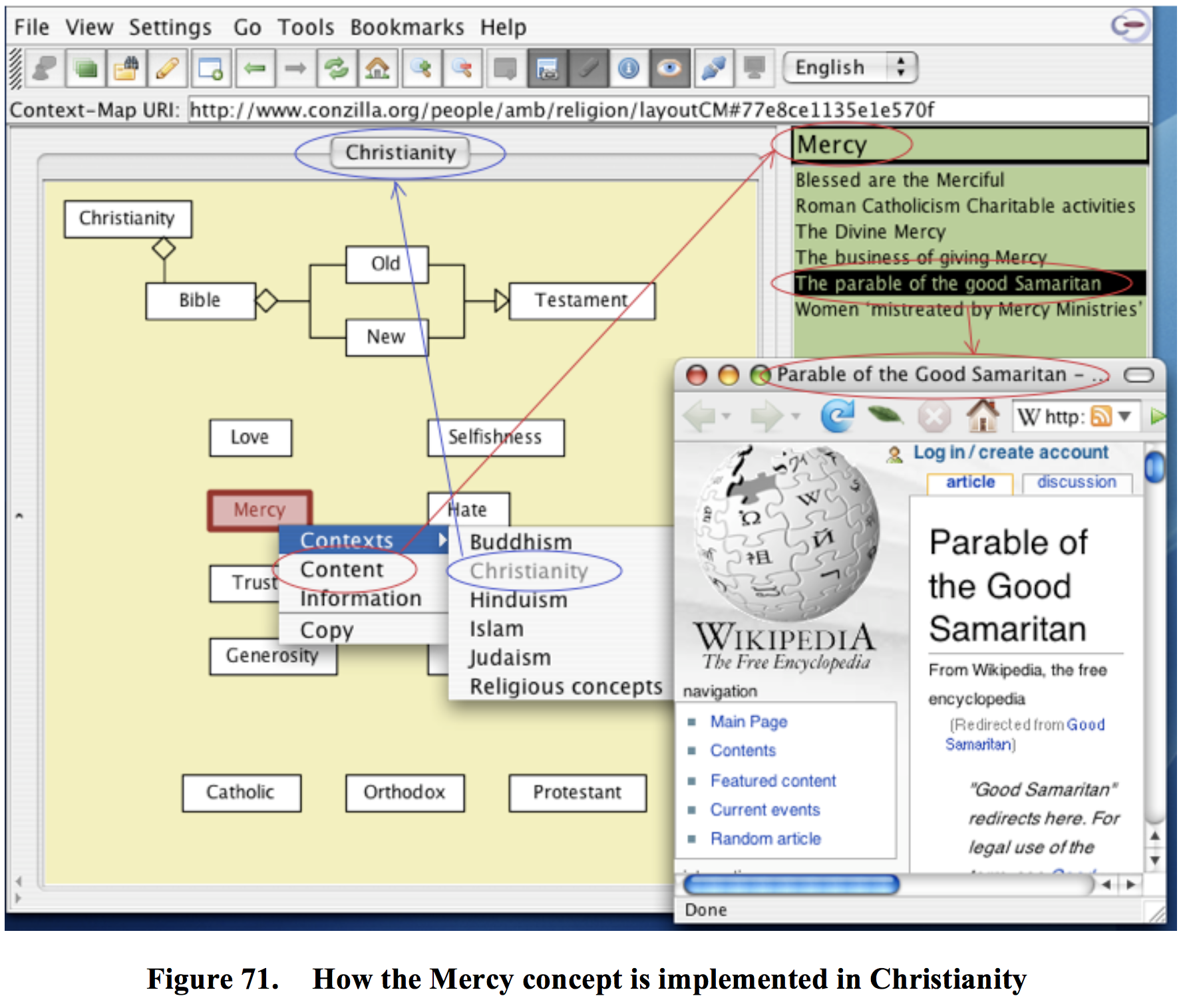 Moreover, one of the content-components – “The parable of the good Samaritan” – has been double-clicked, which brings up your ordinary web browser with a pointer to the underlying web page, which is a Wikipedia article in this case.