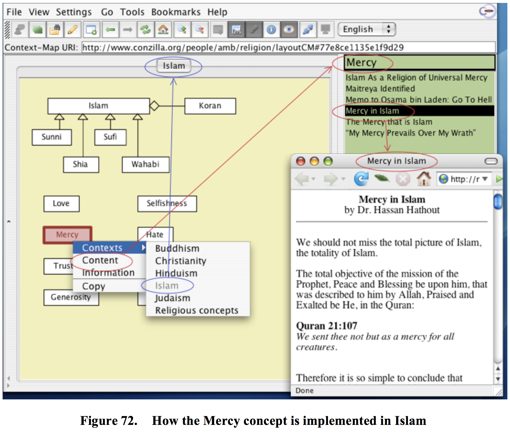 Choosing “Contexts” and then “Islam” leads to the situation depicted in Figure 72. Here we see the Content of the “Mercy” concept being opened up within the context of “Islam”. And the crucial issue is that this content is different, since Islam implements Mercy in a different way.