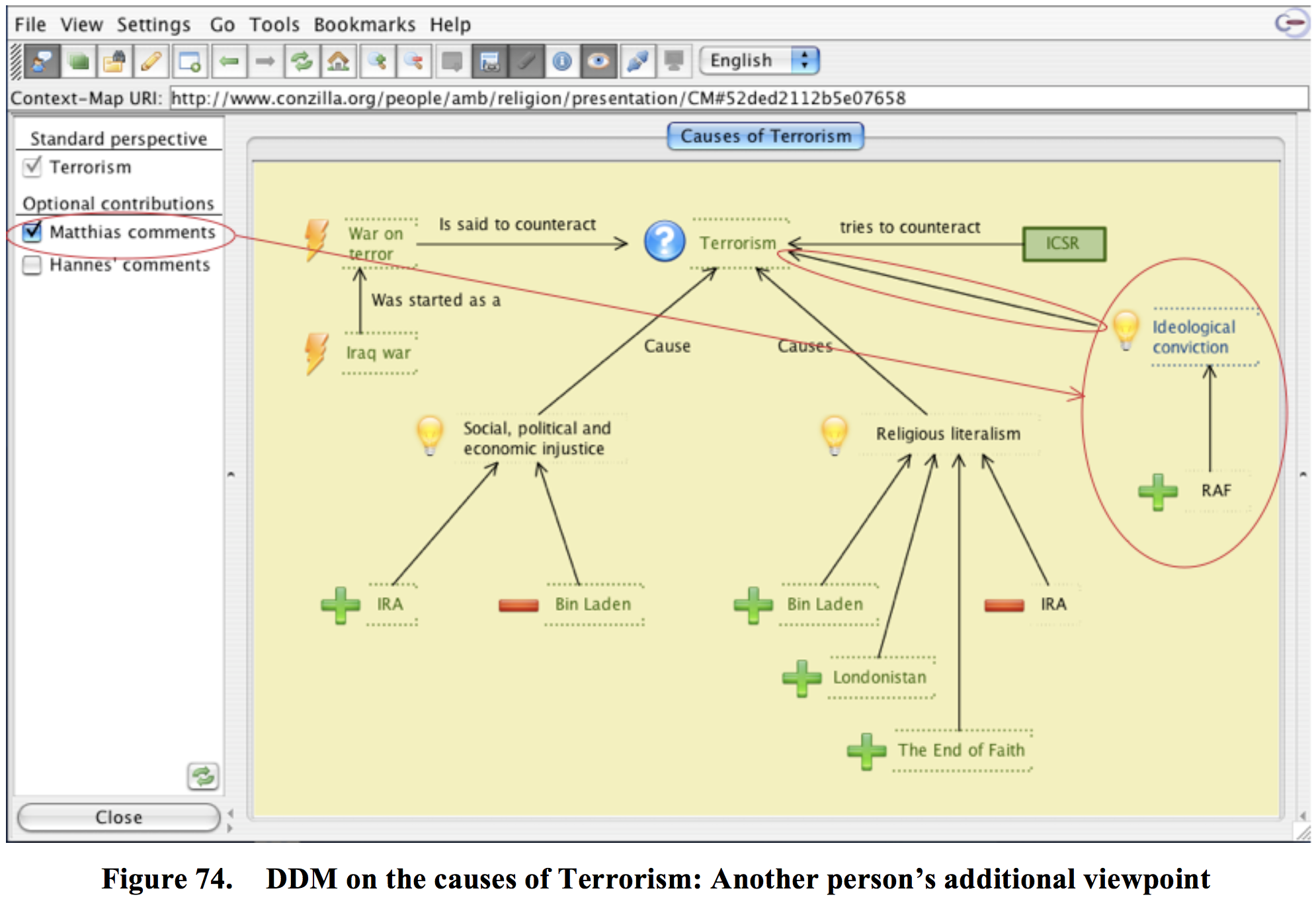 In Figure 74 another perspective has been added by Matthias. By clicking on Matthias’ comments in the field to the left this perspective becomes visible in the original map. It shows that Matthias considers Ideological conviction to be another possible cause for Terrorism and that he considers the RAF (Rote Armee Fraktion).