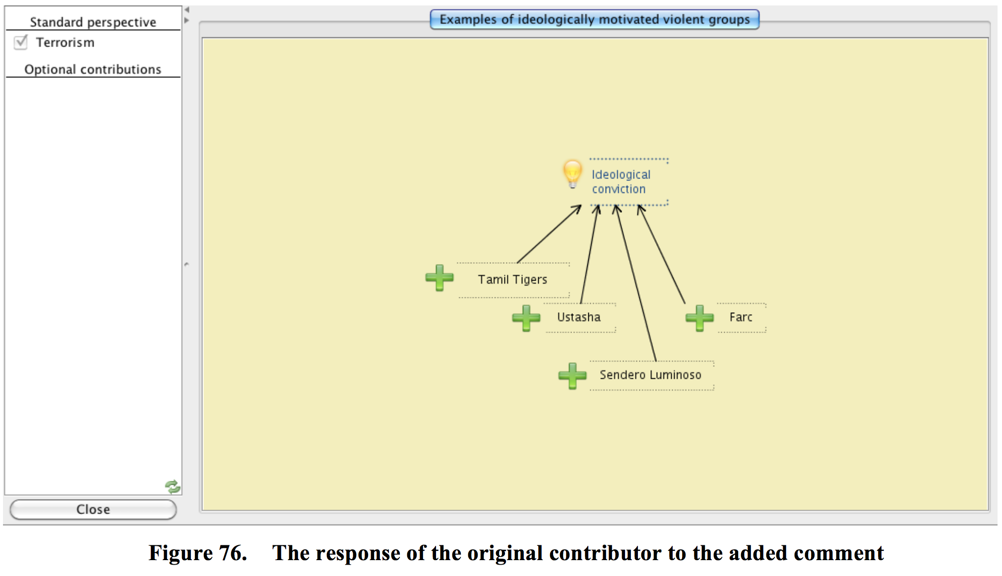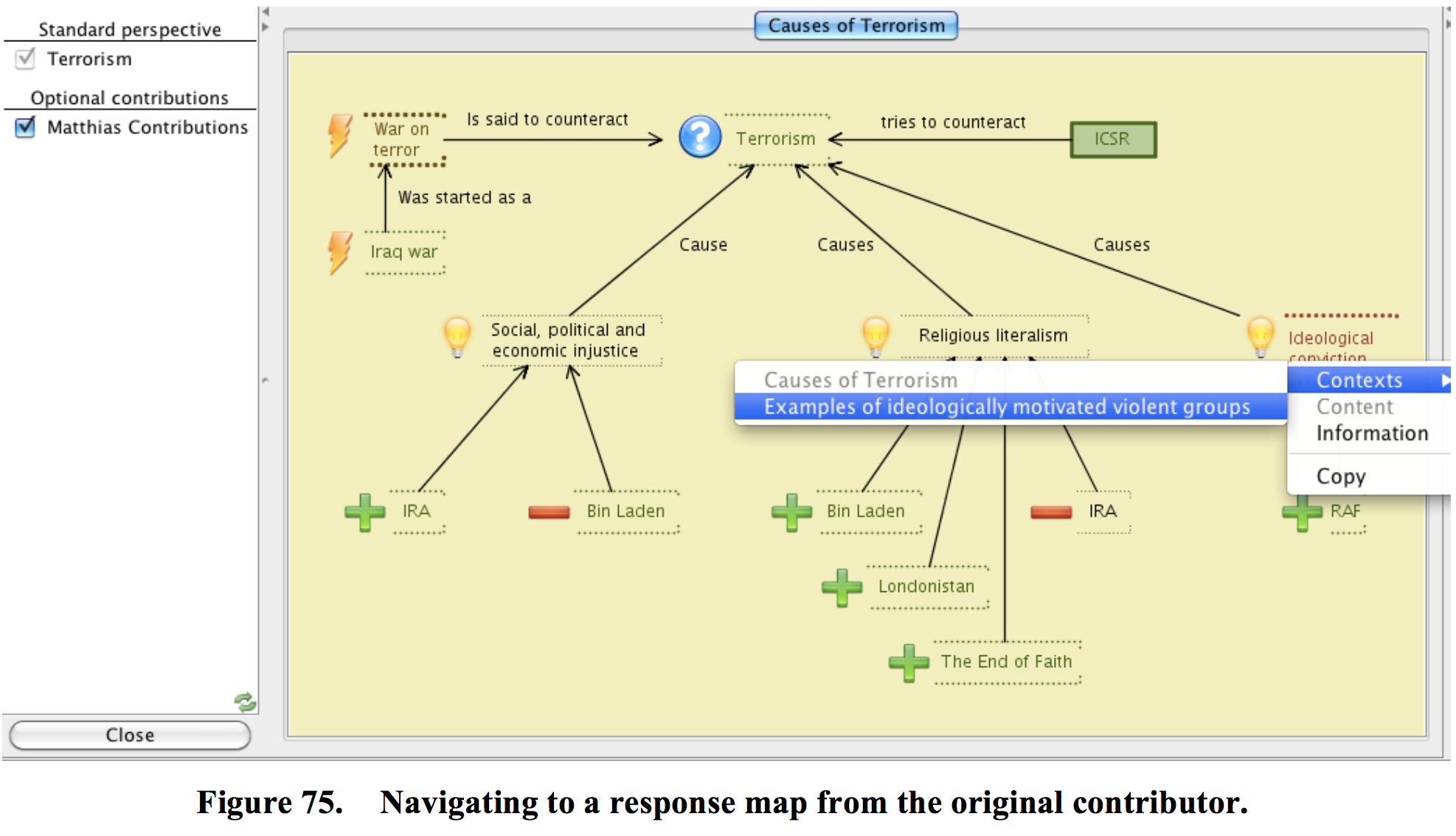 Figure 75 shows a context switch to another map that was created by Ambjörn in response to Matthias’ comments. By copying the concept Ideological conviction into a new map, Ambjörn has added more support for the idea that Ideological conviction can be a cause for Terrorism. Ambjörn has full control of the concepts that he has added, and he can edit and change them as he pleases, but he cannot edit the concept Ideological conviction because this concept belongs to Matthias. However, he can add metadata to this concept (not shown in the figure) and express his ideas on the relevance of this concept to the issue under investigation.