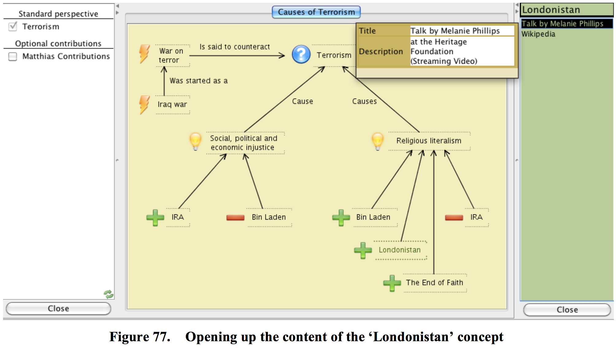 Also, each contributor can support his opinion by providing content in the corresponding concepts. In Figure 77 the content window of the concept Londonistan has been opened, showing the metadata on the first content item Talk by Melanie Phillips.