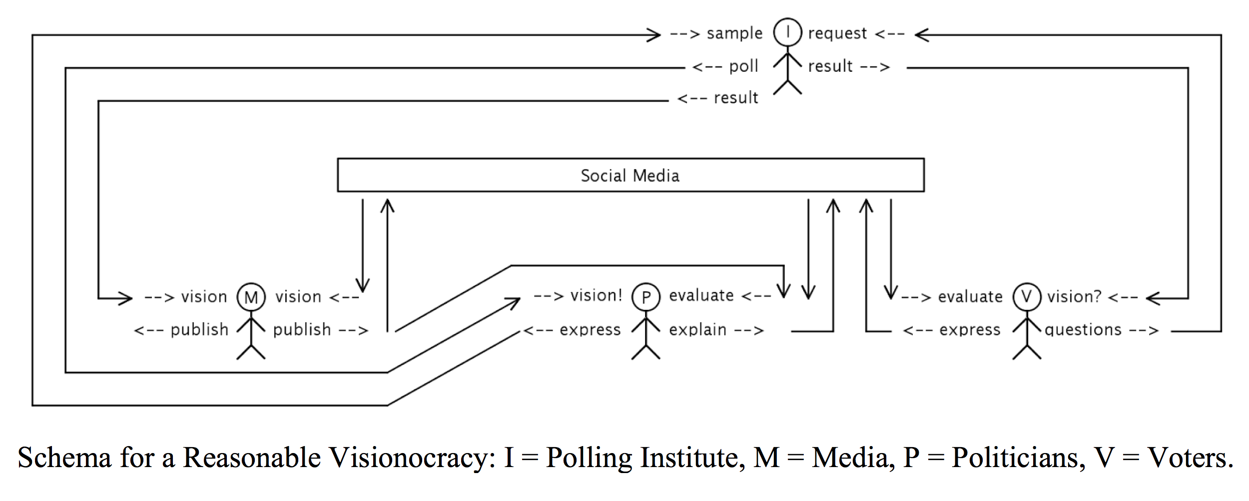In contrast to the opinion polls, which are directed from the politicians to the voters, the “vision polls” of a visionocracy are directed from the voters (via questions) to the politicians, possibly – but not necessarily – mediated and managed by the institutes as requests that trigger them to poll the politicians and inform the media about the sampled results. Meanwhile, this “visionary discourse” goes on in social media, causing everyone to evaluate the effects of their visions, and modify their expressions of them accordingly.