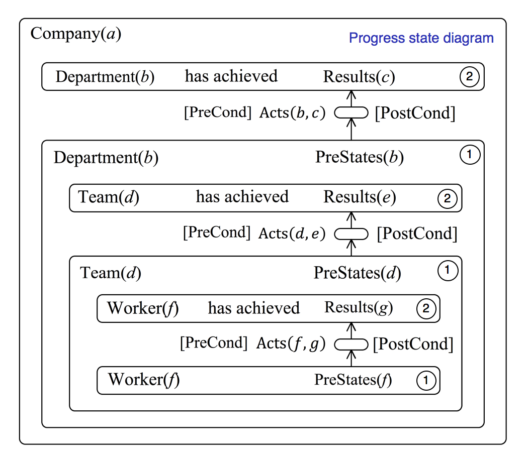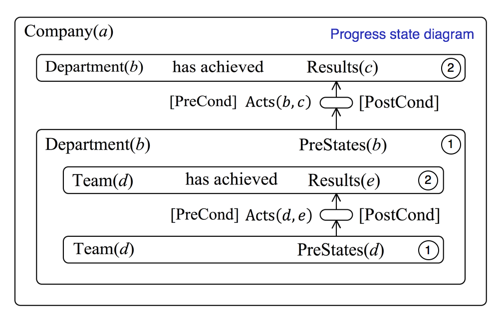 Figure 57 displays more detailed versions of the state diagrams that appear as matrix elements in Figure 56. The progress state diagram to the left of Figure 57 shows that, under the proper [PreConditions] the progress enters the “miniaturised state” in the middle. This state is in fact identical to the top-level state \, A_{cts}(b, c) \,, which appears in Figure 56. In this state of progress, the \, A_{cts}(b, c) \, of working towards the \, R_{esults(c)} \, are actually carried out. When the [PostConditions] are satisfied, the \, R_{esults(c)} \, have been achieved and progress enters the state “ \, D_{epartment(b)} \, has achieved \, R_{esults(c)} \, ”, which is labelled 2 in Figure 57.