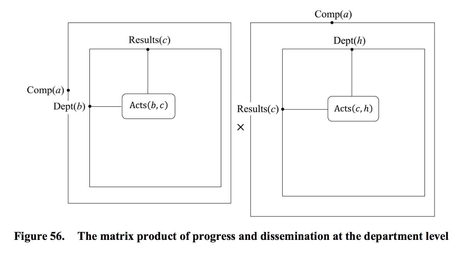 This model of knowledge transfer as a product of progress and dissemination is depicted in Figure 56. The element \, (b, h) \, of this matrix product consists of a sum over all the sets of \, R_{esults(c)} \, that \, D_{epartment(b)} \, is trying to achieve. As shown in Figure 56 and Figure 57, each term in this sum is itself a product of two state diagrams.