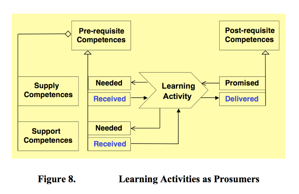 By engaging in a learning activity, a learner creates a prosumer loop around this activity. As shown in Figure 10, the learner aims to obtain some competences that are felt to be needed, and selects a learning activity that promises to deliver these competences under certain pre-conditions. The learner then (implicitly or explicitly) promises to satisfy these pre-conditions by being in position of the pre-requisite supply- and support competences for this learning activity. The learner then delivers on this promise by her/his actual performance when engaging in the activity. The outcome of the activity, i.e., what the activity has in fact delivered, is that the learner has received some competences that have increased the knowledge base of the learner in some way.