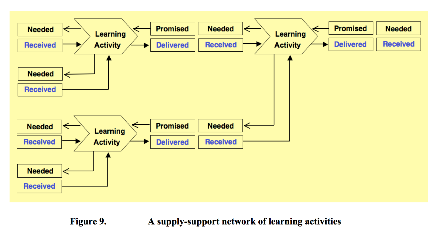 When the learning activities are combined into supply-support networks, the OCA contracts of the previous section appear in the interfaces between them, as can be seen in Figure 9. Just as before, the Promised-Needed part of the contract is planned in advance, whereas the Delivered-Received part is the result of a learner actually engaging in the corresponding learning activity.