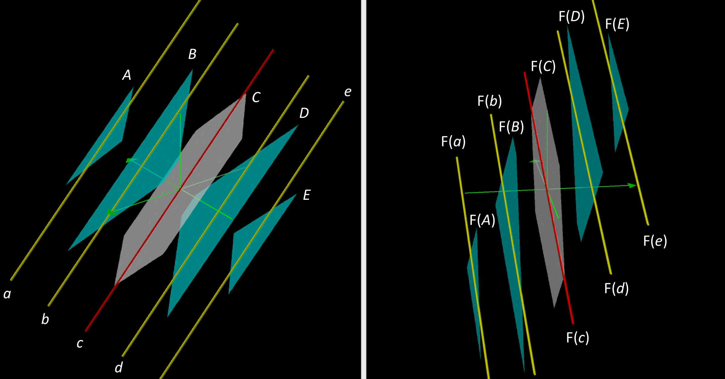 parallel planes and lines of the space probe are mapped by \, F \, into parallel elements.