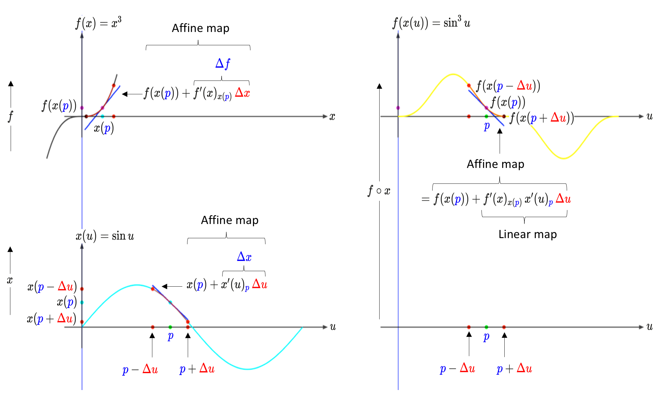 \, \begin{matrix} Y & {\xleftarrow{\;\;\;\;\;\;\;\;\;\; f \;\;\;\;\;\;\;\;\;\;}} & X & {\xleftarrow{\;\;\;\;\;\;\;\;\; x \;\;\;\;\;\;\;\;\;}} & U \\ \uparrow & & \uparrow & & \uparrow \\ f(x(u)) & \xleftarrow{\qquad \qquad \qquad}\shortmid & x(u) & \xleftarrow{\qquad \qquad \qquad}\shortmid & u \\ & & & & & & & \\ Y_{f(x(\textcolor{blue}{p}))} & {\xleftarrow{\;\;\;\;\;\;\;\;\; f_{x(\textcolor{blue}{p})} \;\;\;\;\;\;\;\;\;}} & X_{x(\textcolor{blue}{p})} & {\xleftarrow{\;\;\;\;\;\;\;\;\; x_{\textcolor{blue}{p}} \;\;\;\;\;\;\;\;\;}} & U_{\textcolor{blue}{p}} \\ \uparrow & & \uparrow & & \uparrow \\ & & {x(\textcolor{blue}{p}) + x'(u)_{\textcolor{blue}{p}} \, \textcolor{red} {\Delta u}} & {\xleftarrow{\;\;\;\;\;\;\;\;\; x_{\textcolor{blue}{p}} \;\;\;\;\;\;\;\;\;} \shortmid} & {\textcolor{blue}{p} + \textcolor{red} {\Delta u}} \\ f(x(\textcolor{blue}{p})) + {f'(x)}_{x(\textcolor{blue}{p})} \, \textcolor{red} {\Delta x} & {\xleftarrow{\;\;\;\;\;\;\;\;\;\;\; f_{x(\textcolor{blue}{p})} \;\;\;\;\;\;\;\;\;\;\;} \shortmid} & {x(\textcolor{blue}{p}) + \textcolor{red} {\Delta x}} & & \\ & & & & & \\ Y & & {\xleftarrow{\;\;\;\;\;\;\;\;\;\;\;\;\;\;\;\;\;\;\;\; f \circ x \;\;\;\;\;\;\;\;\;\;\;\;\;\;\;\;\;\;\;\;}} & & U \\ \uparrow & & & & \uparrow \\ (f \circ x)(u) & & \xleftarrow{\;\;\;\;\;\;\;\;\;\;\;\;\;\;\;\;\;\;\;\;\;\;\;\;\;\;\;\;\;\;\;\;\;\;\;\;\;\;\;\;\;\;\;\;\;\;}\shortmid & & u \\ & & & & & & \\ Y_{f(x(\textcolor{blue}{p}))} & & {\xleftarrow{\;\;\;\;\;\;\;\;\;\;\;\;\;\;\;\;\;\; (f \circ x)_{\textcolor{blue}{p}} \;\;\;\;\;\;\;\;\;\;\;\;\;\;\;\;\;\;}} & & U_{\textcolor{blue}{p}} \\ \uparrow & & & & \uparrow \\ {(f \circ x)(\textcolor{blue}{p}) + (f \circ x)'(u)_{\textcolor{blue}{p}} \, \textcolor{red} {\Delta u}} & & {\xleftarrow{\;\;\;\;\;\;\;\;\;\;\;\;\;\;\;\;\;\;\;\;\;\;\;\;\;\;\;\;\;\;\;\;\;\;\;\;\;\;\;\;\;\;\;\;\;\;}\shortmid} & & {\textcolor{blue}{p} + \textcolor{red} {\Delta u}} \end{matrix} \, .