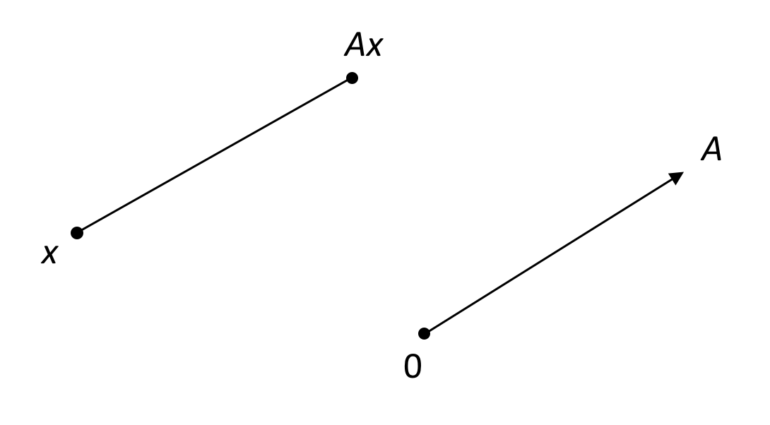 In affine geometry a vector \, A \, is in fact a displacement vector which defines a rectilinear displacement (= a translation) \, \overrightarrow {x ,A x} \, between the points \, x \, and \, A x .