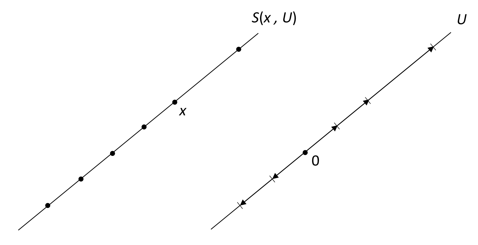 Continuing with dimension two, we suppose that \, U \, is a one-dimensional linear subspace of \, V \, and that \, x \in X . We picture \, U \, and \, S(x, U) \, as in Figure 12.1: