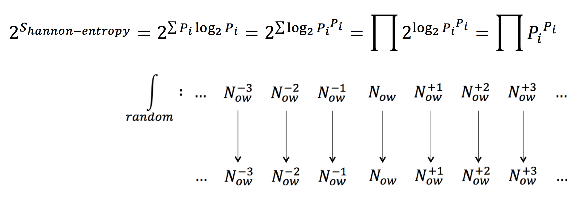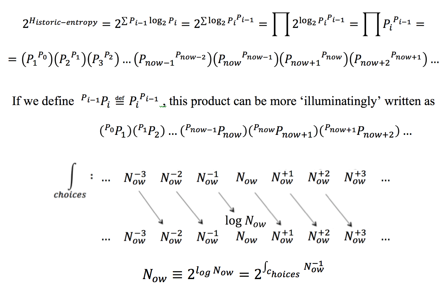 2^{\, H_{istoric-entropy}} = 2^{\; \sum {P_{i-1} \log P_i}} = 2^{\; \sum {\log {P_i}^{P_{i-1}}}} = \prod {P_i}^{P_{i-1}} \, .