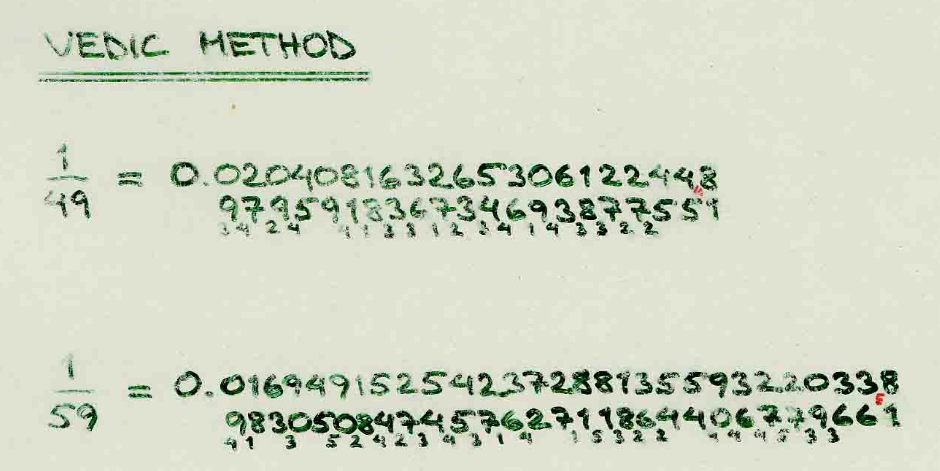 We next take up the and examine the case of 1/49 which, besides following the rules hereinabove explained, has the additional merit of giving us the clue to a still easier process for the conversion of vulgar fractions into their recurring decimal shape: